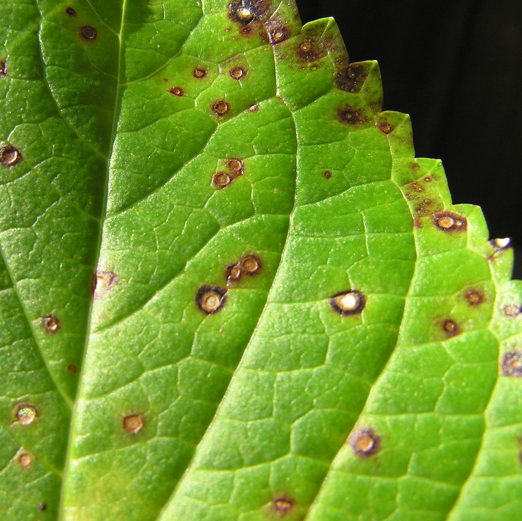 Tiny reddish-brown spots appear on the leaves of infected plants and darken as the leaves mature. Spore forming bodies eventually appear in the center of the spots. These spores overwinter on fallen leaves and spread from infected tissue to healthy leaves by splashing raindrops or irrigation.