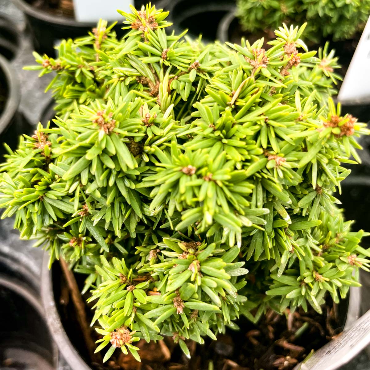 ‘Abbott’s Pygmy’ is one of the smallest Canadian Hemlocks, featuring a compact, globe-like form densely covered in dark green needles. Its petite stature makes it a perfect choice for tight spaces, rock gardens, raised beds, or troughs, where even subtle details can shine.