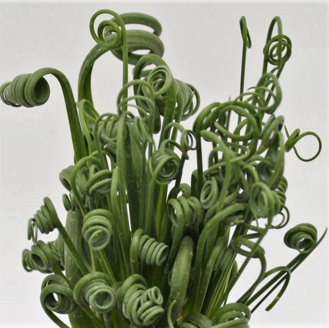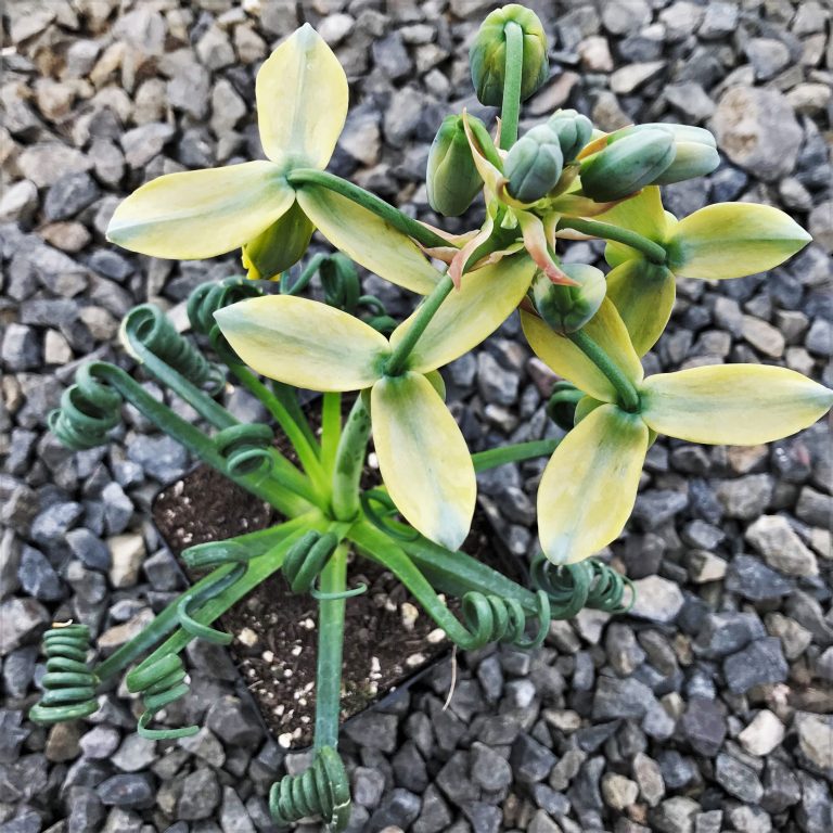 Narrow, cylindrical leaves emerge from a bulbous base and curl into springs and coils. Winter flowers are pendant, yellow-green, and smell of green olives.