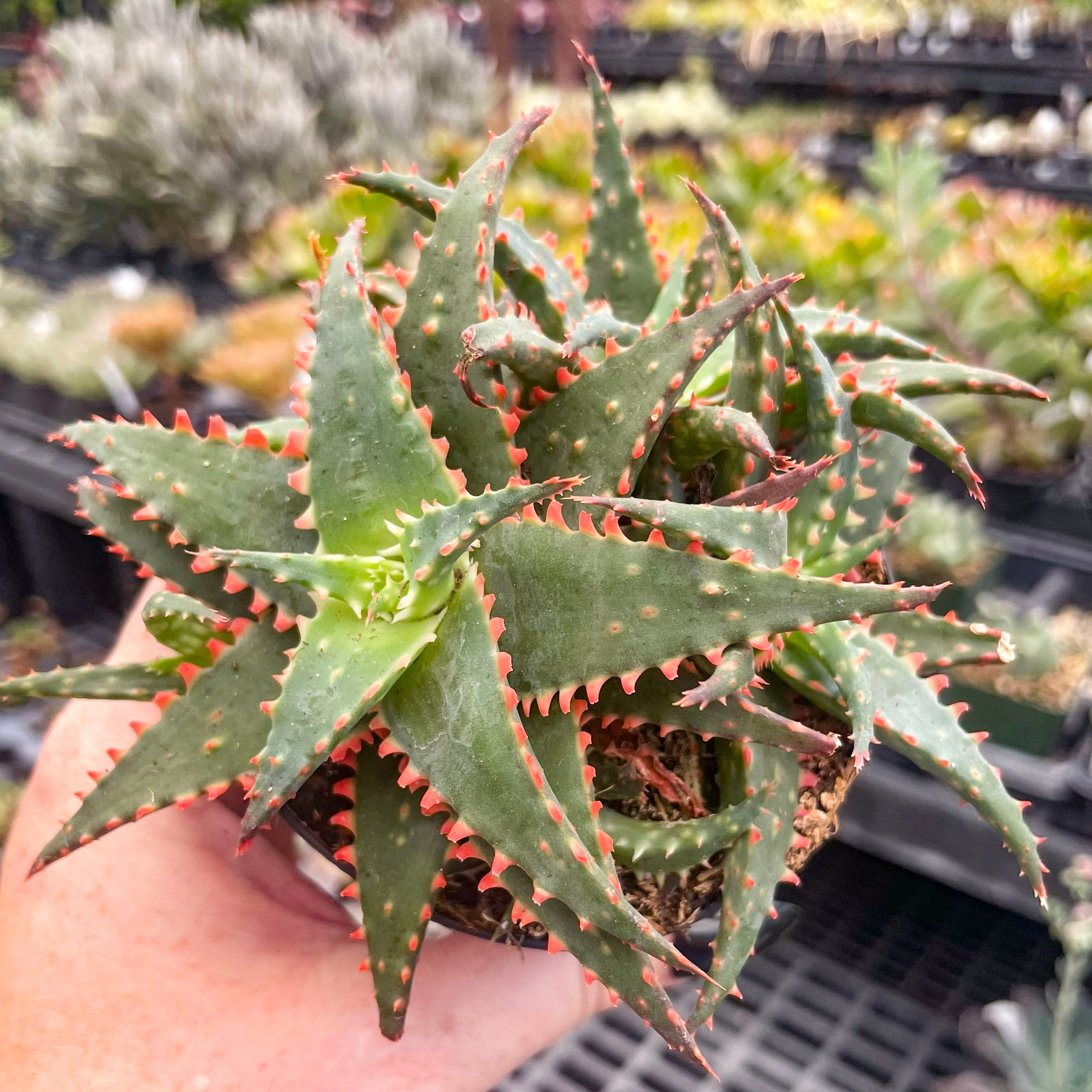 Jolly old St. Nicholas can only dream of this fantastic clump-forming succulent serving as his sleigh. It certainly wouldn’t require nine reindeer. Part of our Star Aloe program, Aloe 'Christmas Sleigh' is compact and colorful, evoking the green and red colors of Christmastime. This small Altman Plants original hybrid abounds with red teeth on the margins of its leaves and red bumps down the middle of them. Reddens up, with a deep blue base, with good sunlight. In filtered sunlight, the leaves will display a greener shade of handsome. Terrific as a miniature container specimen or as a focal point in a dish garden with other succulents. Perhaps as an otherworldly starfish cluster in an underwater-themed fairy garden. Tubular red flowers in spring. Virtually maintenance free and drought tolerant.