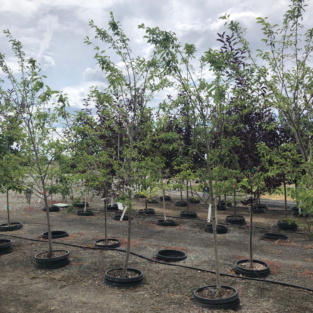This tremendously popular tree offers white blossoms in spring, followed by showy, sweet purplish-black fruit. Heavily branched, the tree has an interesting spreading branch pattern, and attractive light gray bark. The brilliant fall leaves are quite persistent.