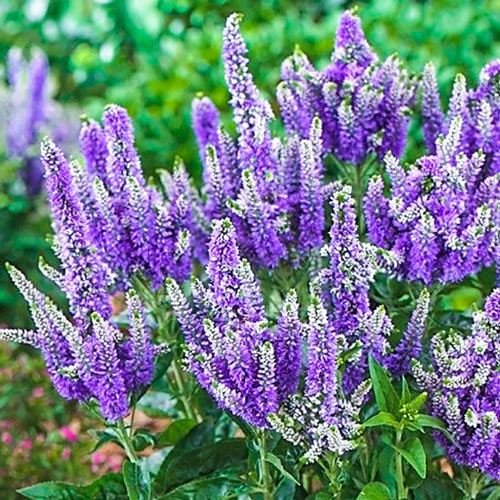 Plumes of tightly bunched deep violet-blue flowers on strong stems from late spring until fall. Compact dark green foliage.