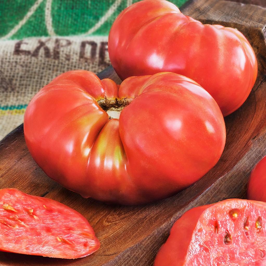 An improved hybrid, this huge red beefsteak produces large, meaty, classic beefsteak-type tomatoes on indeterminate vines until frost. Fruit is tolerant of cracking. Great for sandwiches and big, fat slices. Flavor is mild and sweet. Grow it in a tall cage or tie to a stake for support.