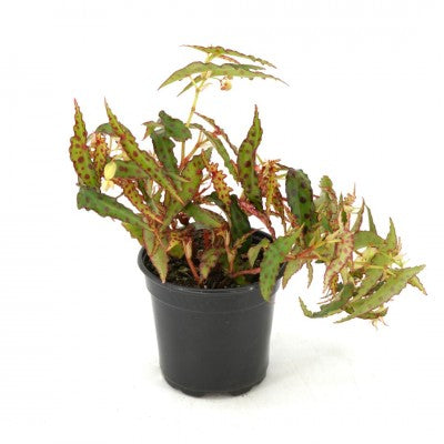 Begonia amphioxus has leaves that are lance shaped and pointed at both ends. The large maroon spots on the narrow green leaves give it an “other worldly” appearance. The flowers are green and have an unusual shape but not very showy.