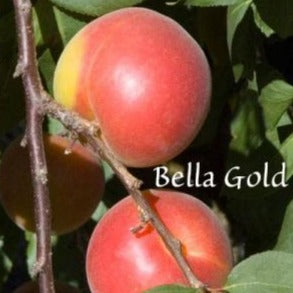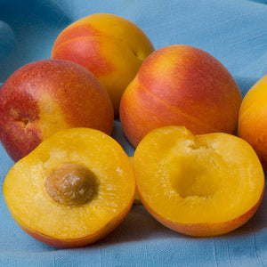 Peach x apricot x plum. Slightly fuzzy skin, like that of an apricot, is bright yellow with an attractive red blush. Tart skin gives way to mildly sweet amber flesh for a delightful eating experience. Naturally semi-dwarf tree.