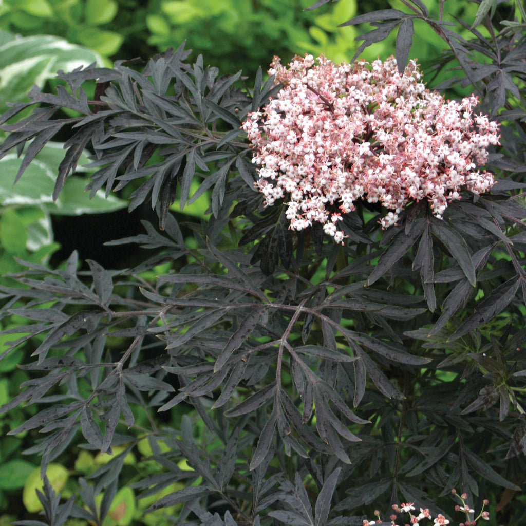 A totally new type of elderberry. The dark purple, finely cut foliage has an exotic appeal usually found only in Japanese maples. Pink buds open to lacy white blossoms in May to June. Excellent specimen plant and also attractive in large containers.
