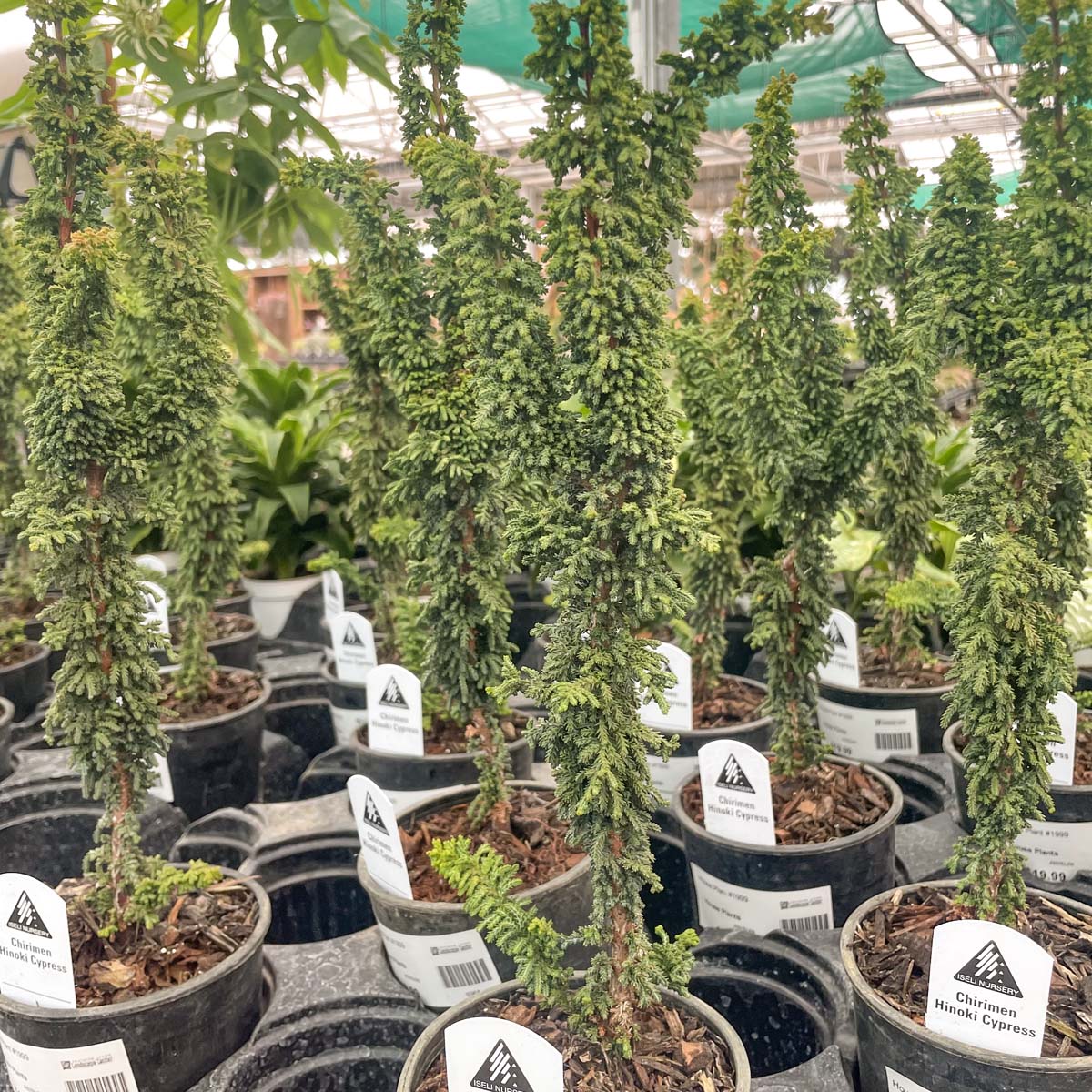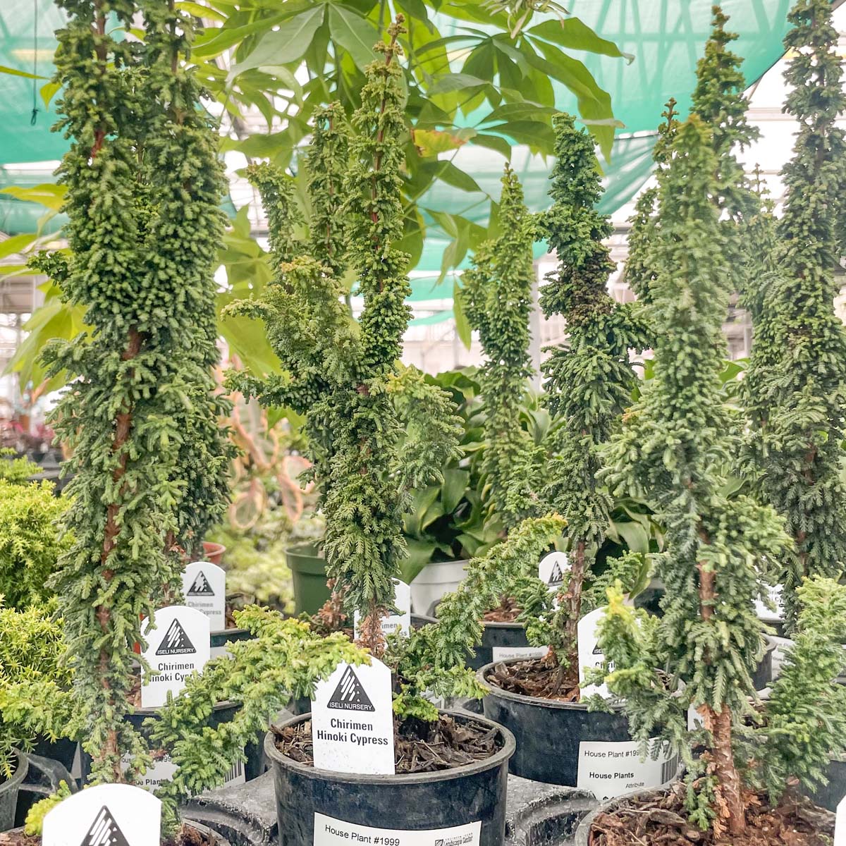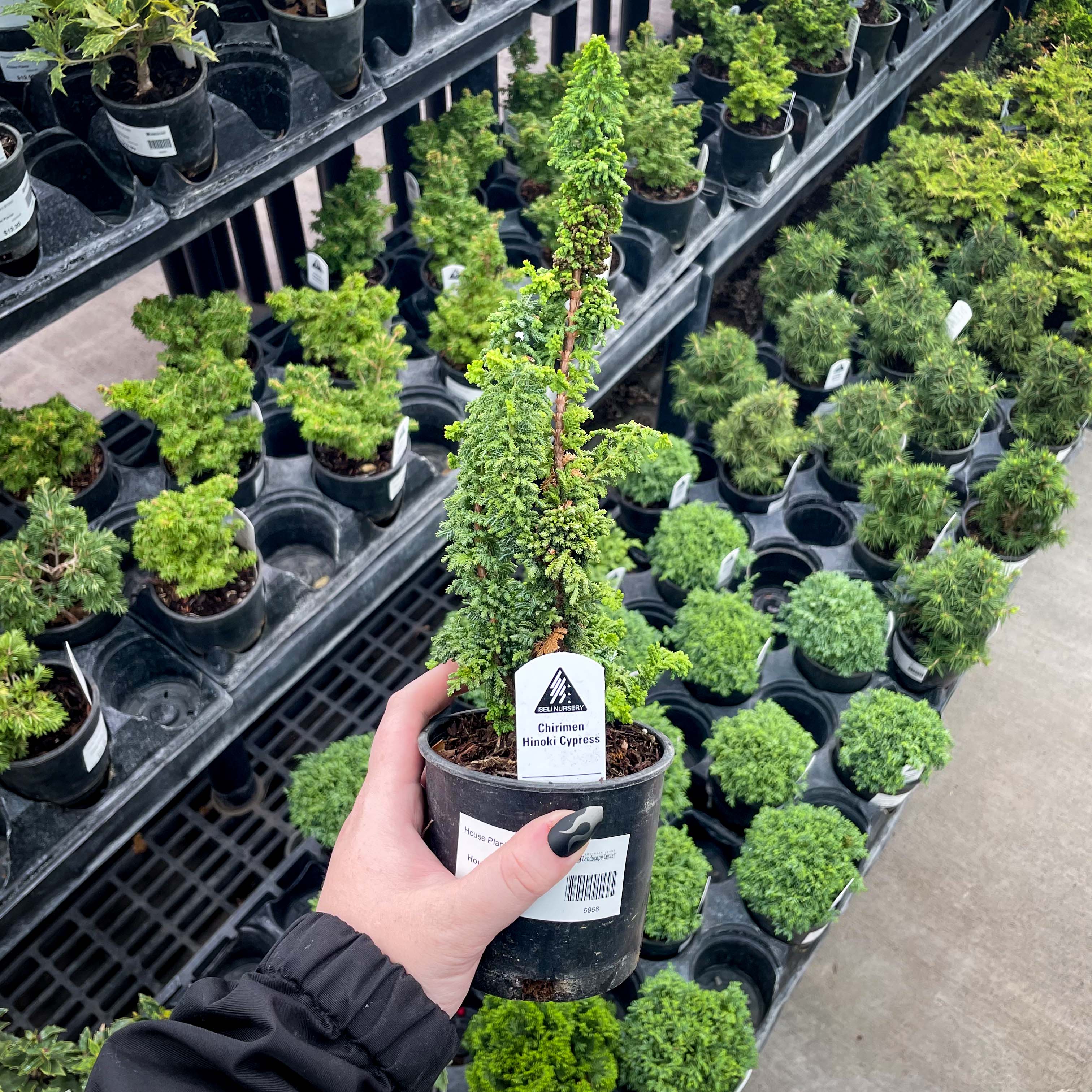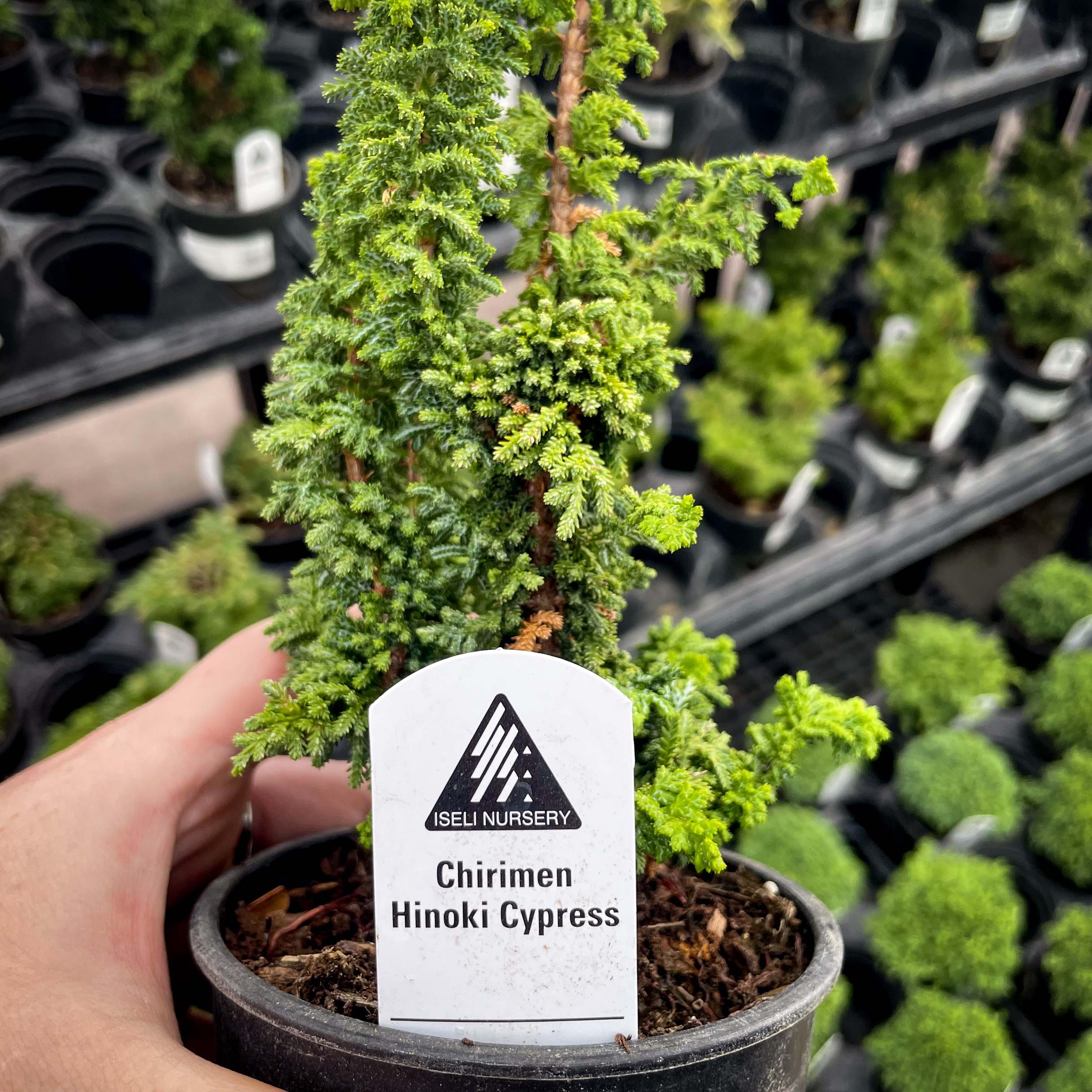 ‘Chirimen’ is a distinctive Hinoki cypress known for its crinkly, bottle-brush-like foliage that boasts both juvenile and adult textures in shades of blue and green. Taking its name from a traditional Japanese crepe fabric, ‘Chirimen’ offers a striking, textural display unique among Hinoki cultivars.