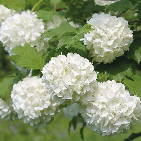 A most popular old-fashioned plant. Bright green foliage changes to vibrant red fall color. Pure white snowball-like flower clusters cover the shrub for a lengthy spring to summer period. Also known as Viburnum opulus 'Sterile'.