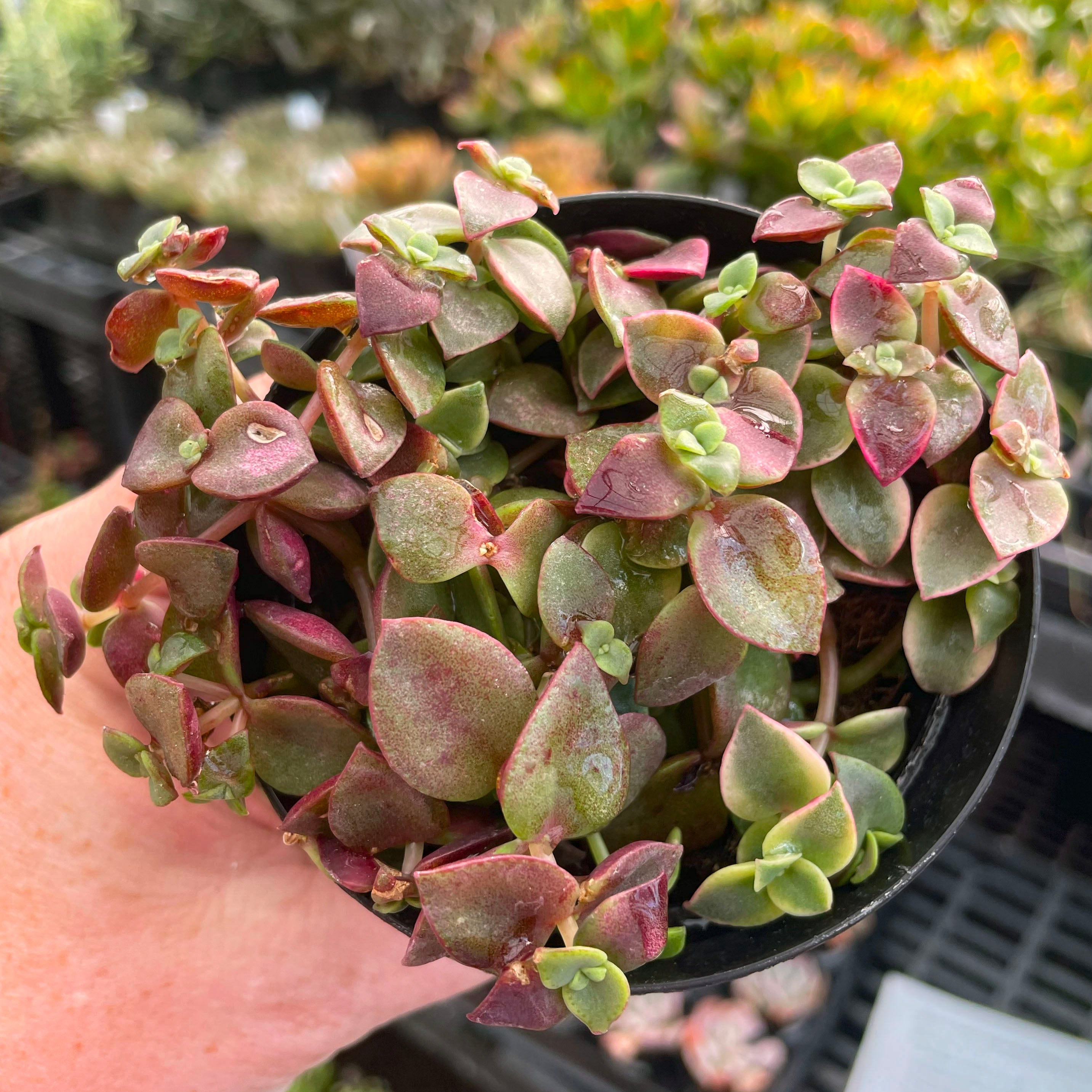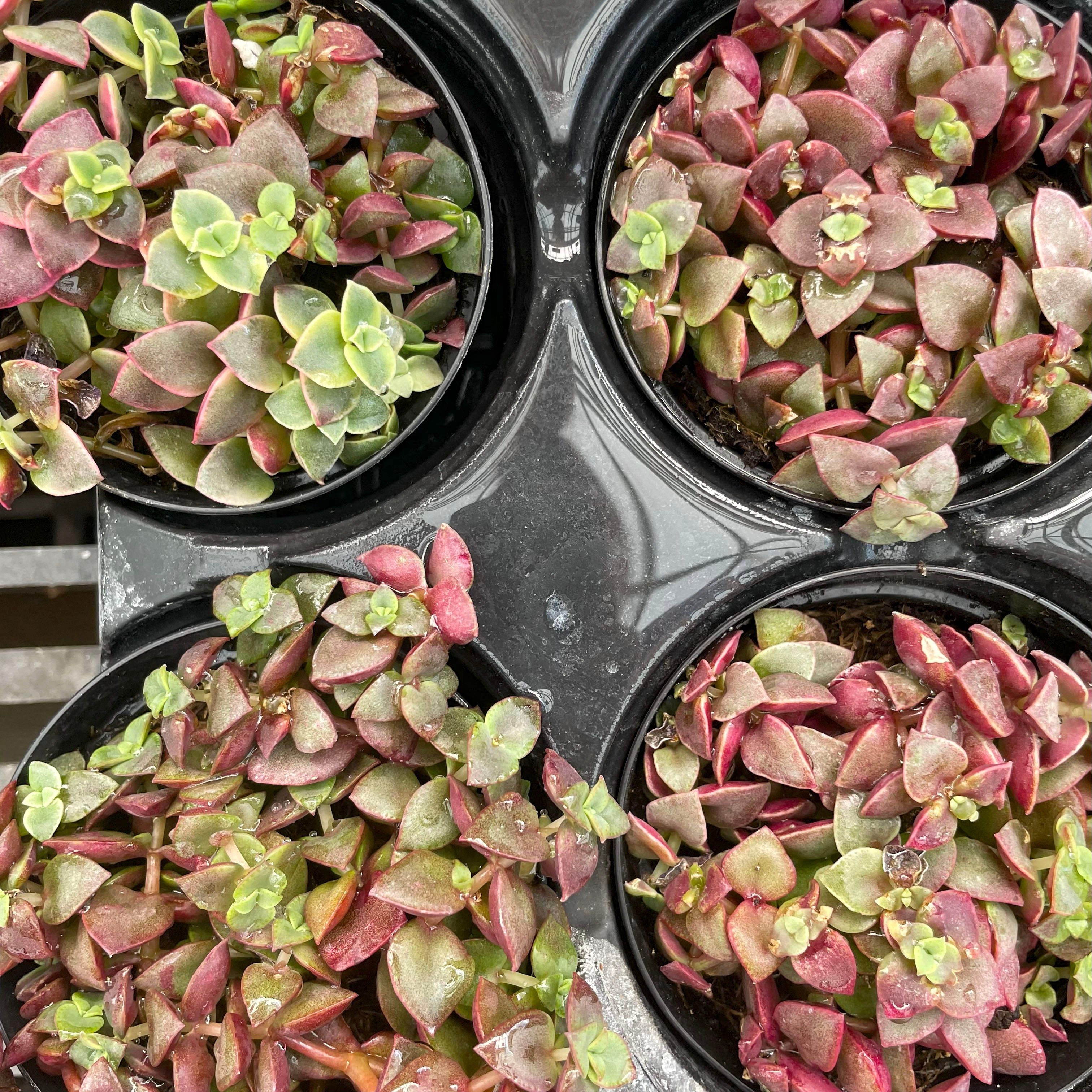 The green, lemony cream and pink leaves of 'Calico Kitten' blush a beautiful rose-lilac in drought or cold. Other variations of this variegated plant can come in greens and purples. This multicolored creeper is a go-to accent for succulent dish gardens, serving as an eye-catching contrast to rose-shaped succulents such like echeverias as well as upright growers. Excellent as a hanging basket or for spilling over the sides of a rock wall or along a dry creek bed. Tuck into the nooks and crannies of a waterwise garden where frost is not a concern.