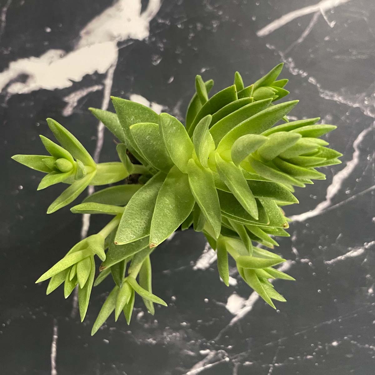 Crassula capitella subsp. thyrsiflora is a geometric wonder! This cool plant sports triangle-shaped leaves that grow around the stem, stacked on top of each other in a tall tower of succulent bliss. In order to achieve the red coloring, the plant needs LOTS of light and remember not to overwater.