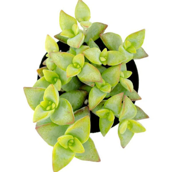 Crassula conjuncta, native to Africa, forms stems with leaves arranged in offsetting ranks. Stems elongate to form large "string of buttons". Leaves are triangular in shape, glaucous bluish-green in color and are margined with bright red. Offsets freely to form large clusters that are excellent for rock gardens or hanging baskets.