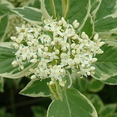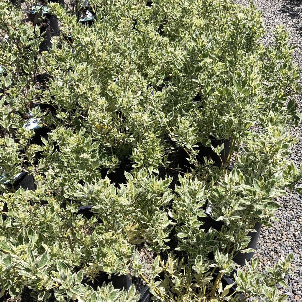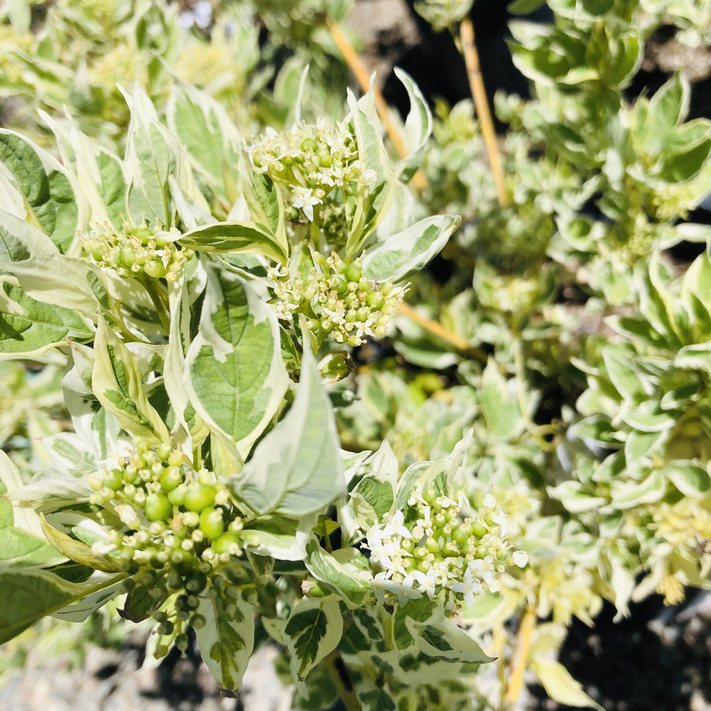 A compact variegated dogwood with mint green foliage thinly edged in white. Vibrant lime-green stems make this a unique variety and a standout in the winter landscape!