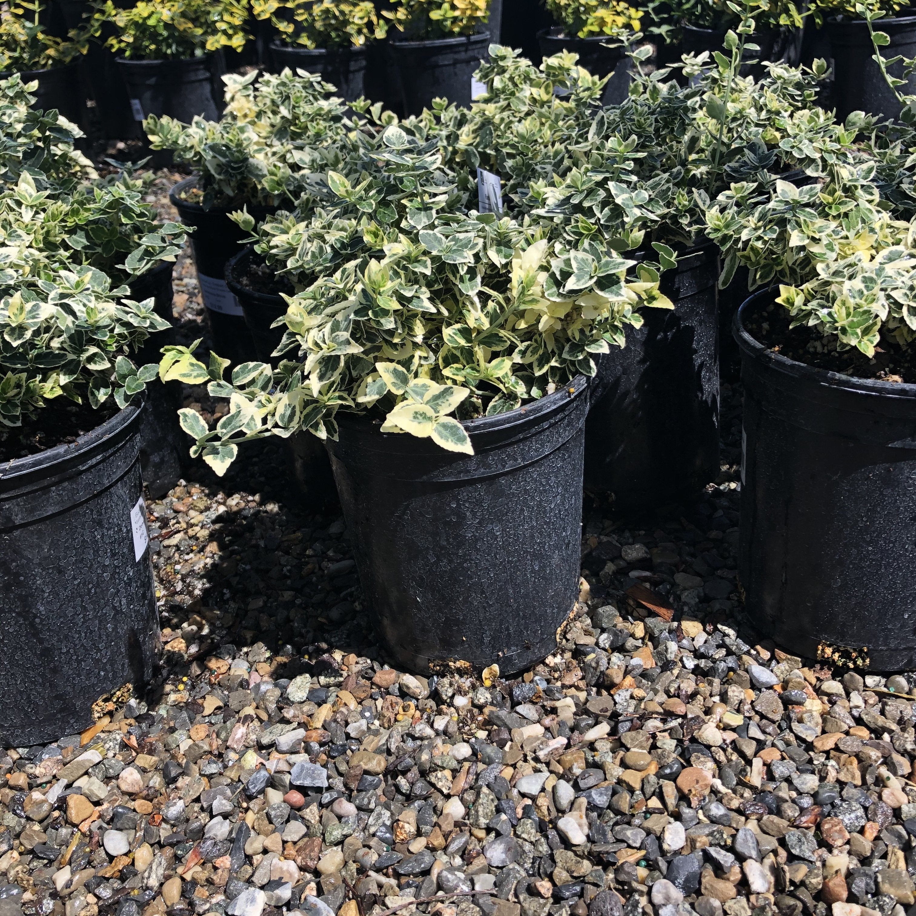 Tends to grow a bit wider than tall but can be trained to climb. It is densely branched, with rounded, glossy deep emerald green leaves and irregular creamy white margins. Foliage acquires pink tones as the cool of winter arrives.