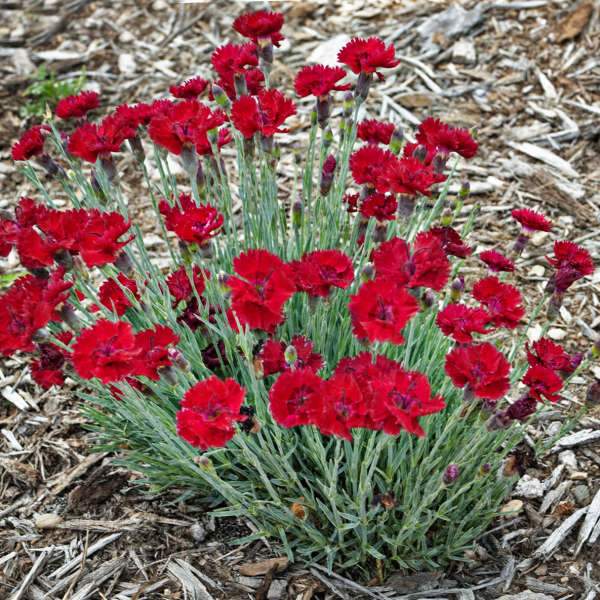 Vivid fire red flowers have a deeper crimson eye, making this a "saturated red bicolor". The evergreen, glaucous grey-green foliage provides a stark contrast for these shockingly bright flowers. Even more wonderful, they exude the spicy scent of cloves. Though budding is most prolific in early summer, plants will rebloom in the fall if spent flowers are removed.