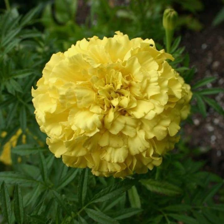 An exceptionally nice medium-sized plant, 20 inches tall, covered with sunny yellow flowers 3 1/2 inches across. The full double blooms are held well above the foliage and are a nice size in proportion to that of the plant. It is very striking in mass plantings or borders and also suitable for large containers.