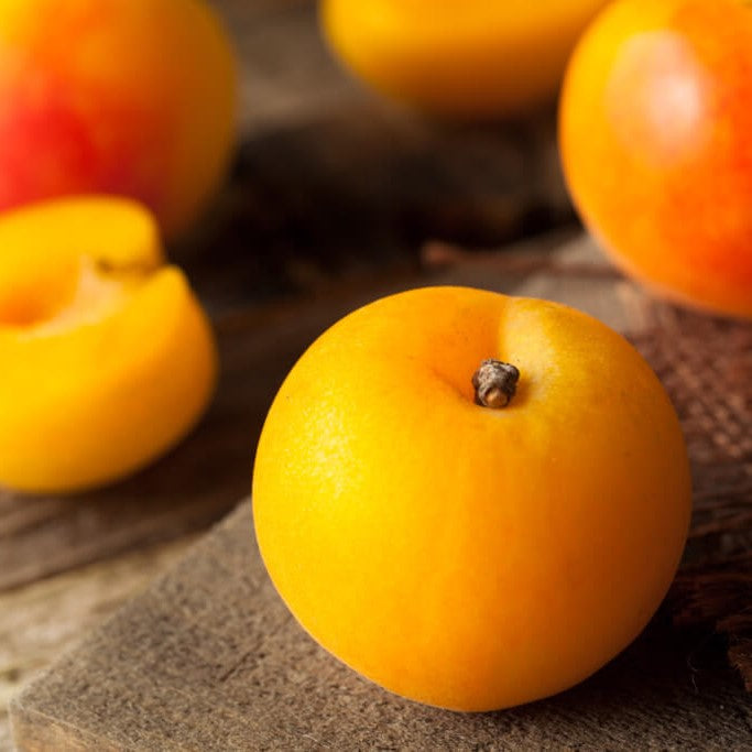 With the size and shape of a plum but translucent golden skin and firm yellow flesh, the Flavorella plumcot is a clingstone and a pleasant surprise for consumers. The fruit features a pronounced aroma reminiscent of a Santa Rosa plum, while the tart skin is slightly pubescent like an apricot.