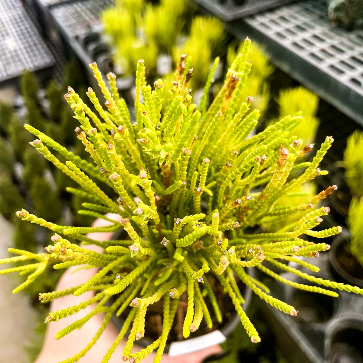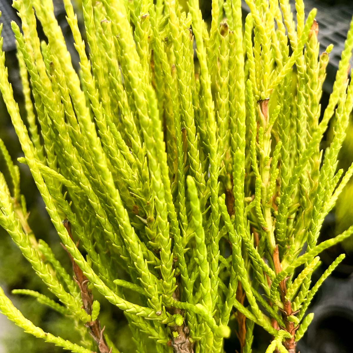 ‘Franky Boy’ is a unique Oriental Arborvitae that displays vibrant lemon-yellow filaments of foliage waving atop a lime-green interior. This airy, grass-like texture adds dynamic movement and color contrast to the garden, yet unlike ornamental grasses, it offers year-round interest without seasonal die-back.