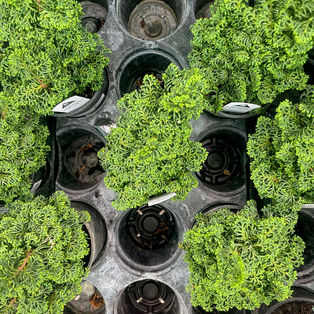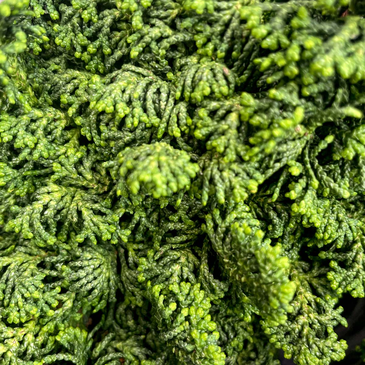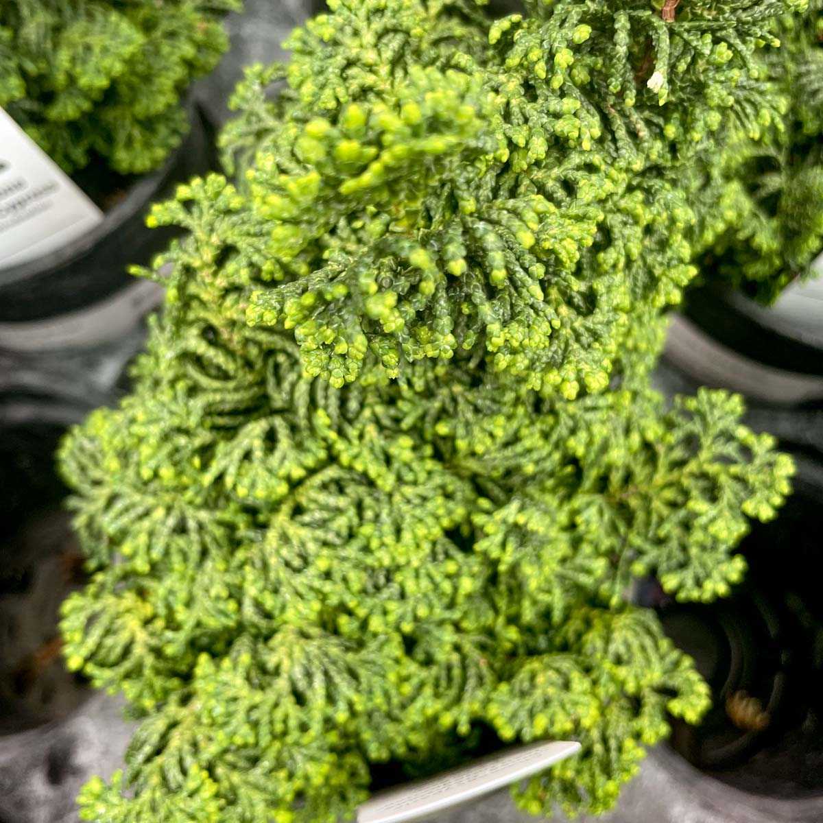‘Gemstone’ Hinoki cypress is a dense, dramatic conifer prized for its layered fans of green foliage. Intricate shades of lighter and darker green blend seamlessly, giving it a vibrant, textured appearance. This slow-growing selection matures into an irregular, upright form, creating remarkable presence in even the smallest garden spaces.