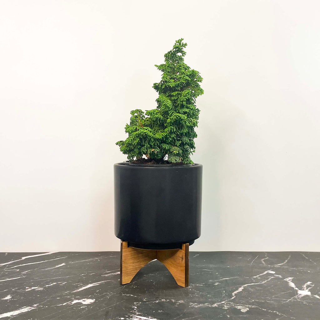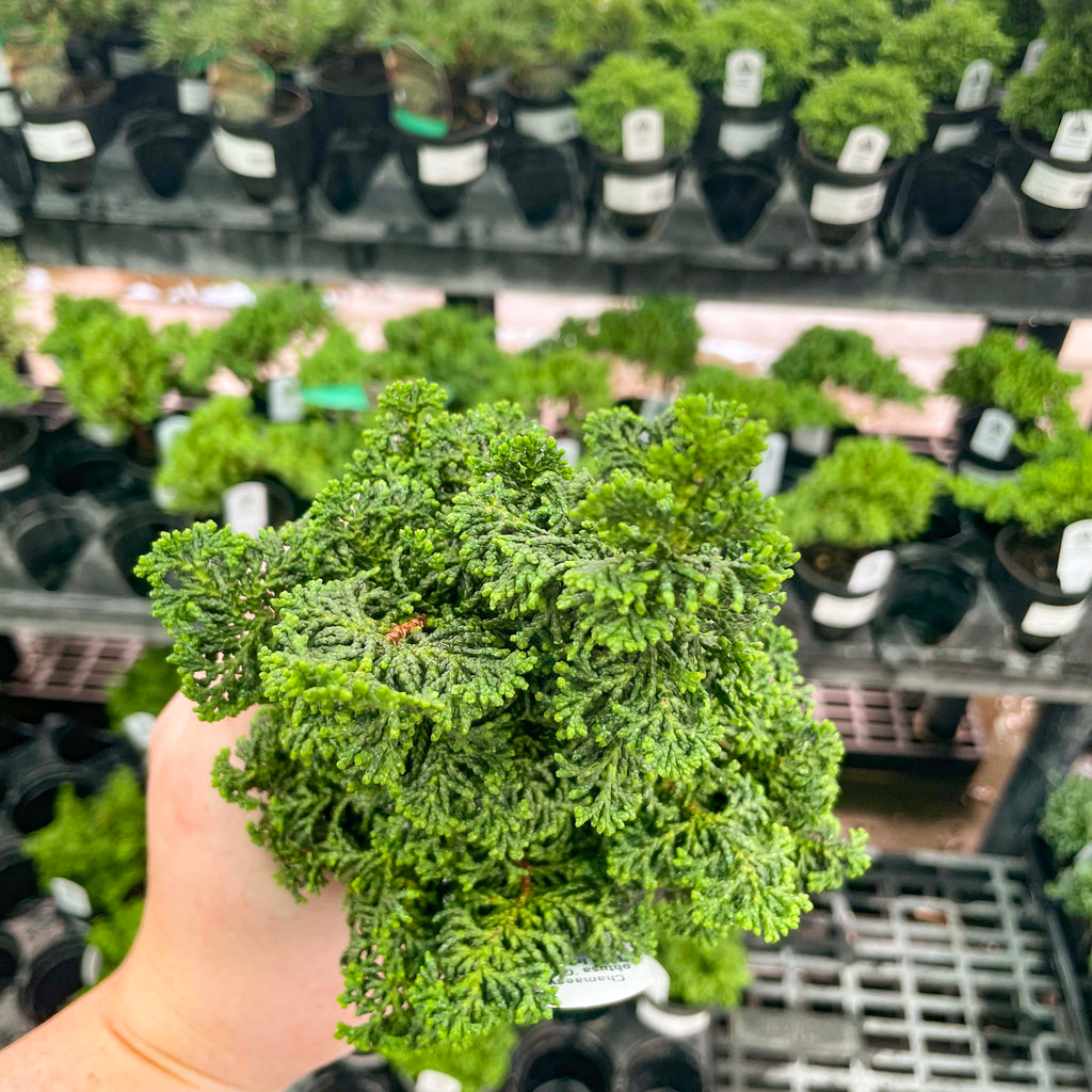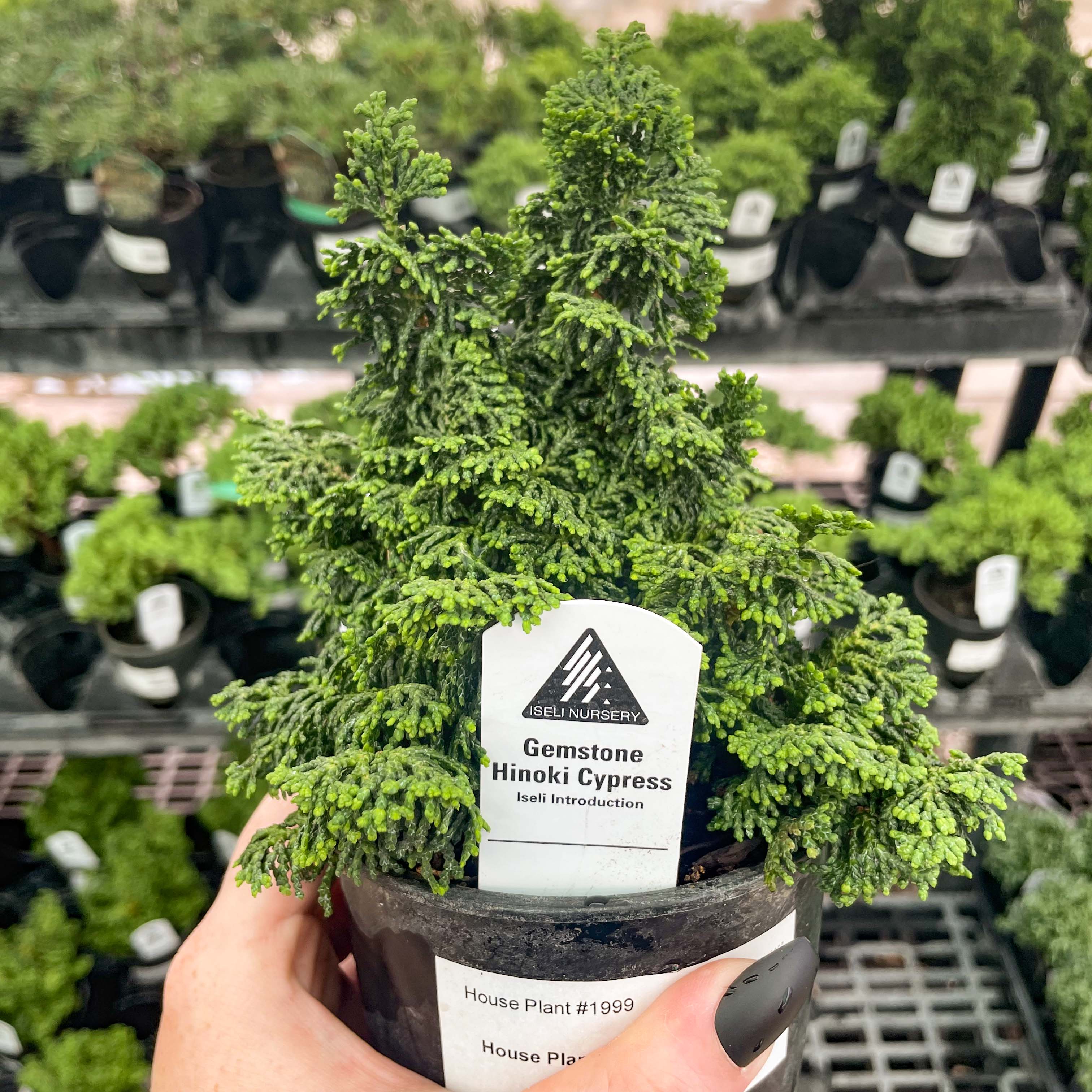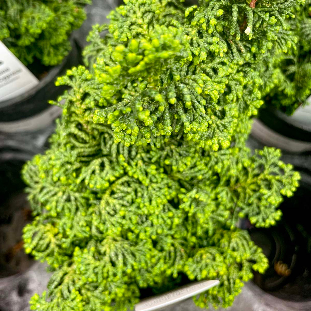 ‘Gemstone’ Hinoki cypress is a dense, dramatic conifer prized for its layered fans of green foliage. Intricate shades of lighter and darker green blend seamlessly, giving it a vibrant, textured appearance. This slow-growing selection matures into an irregular, upright form, creating remarkable presence in even the smallest garden spaces.