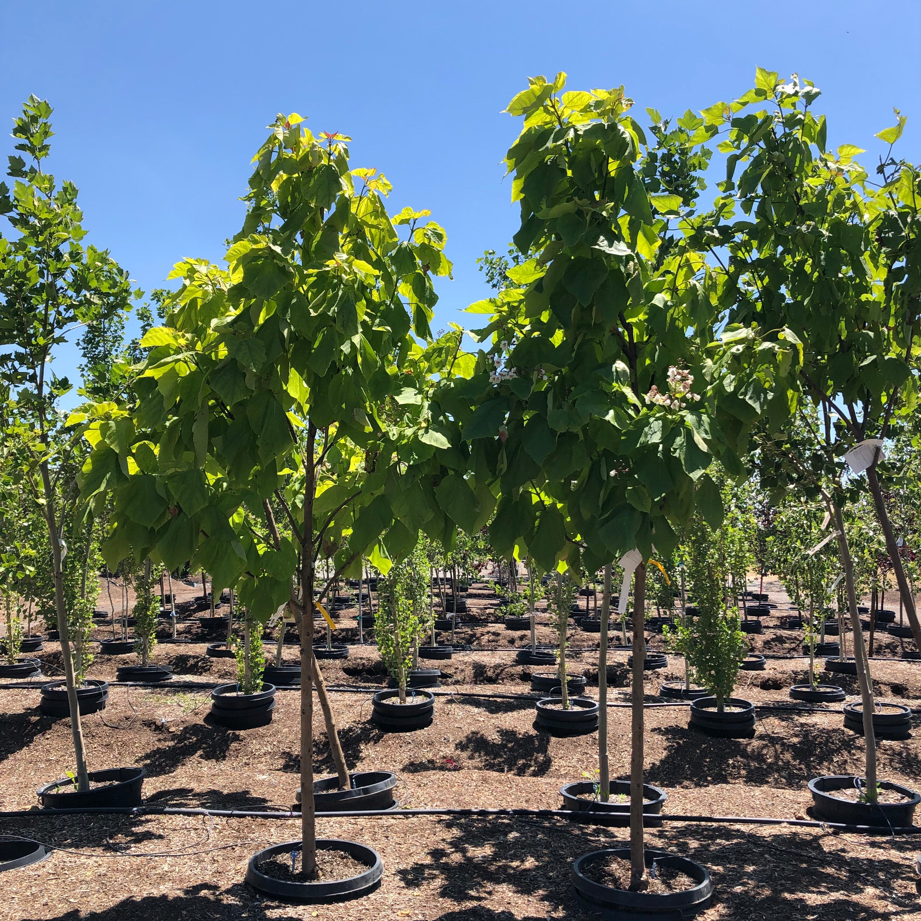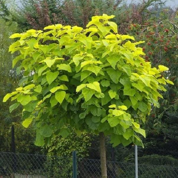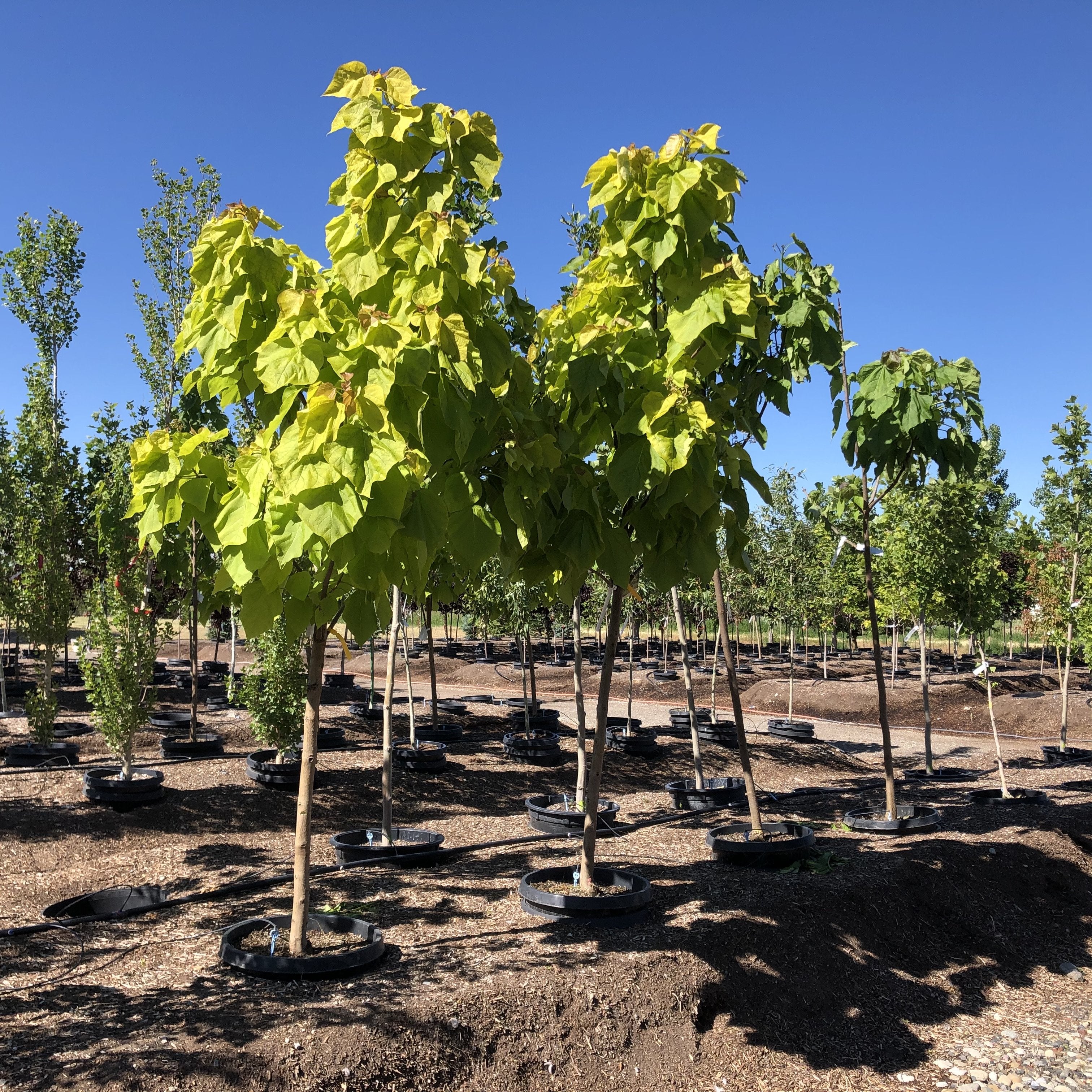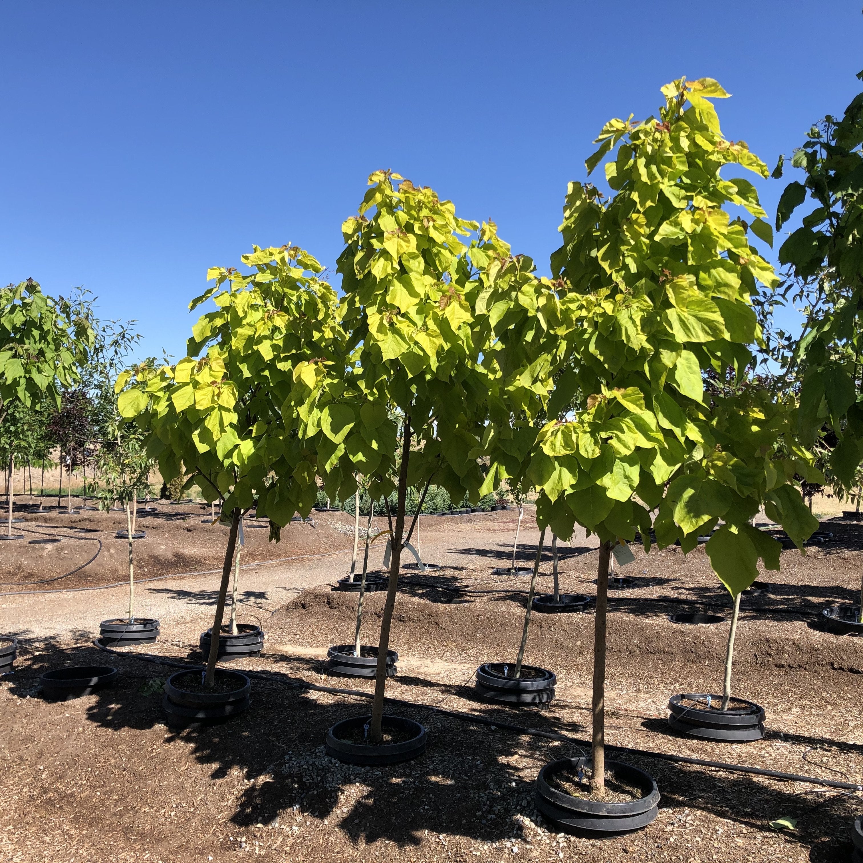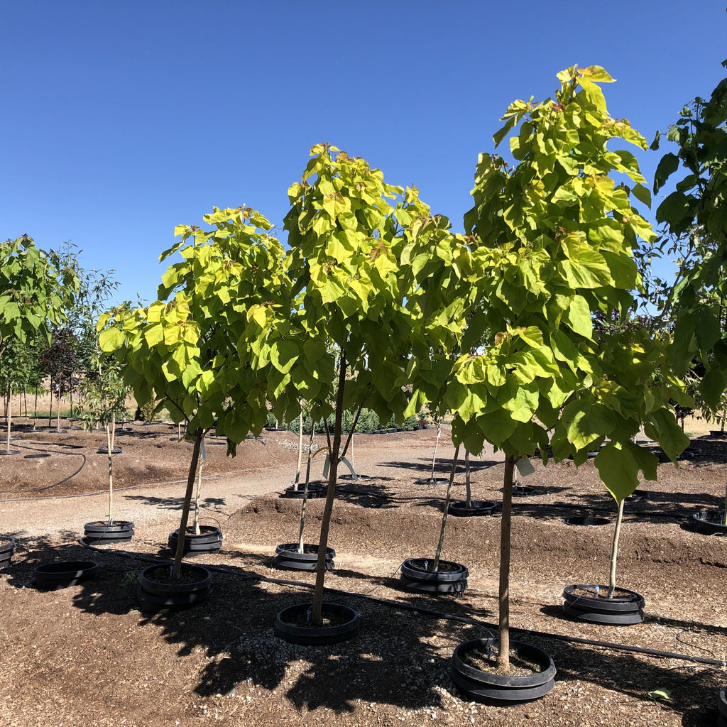 A bold accent in the landscape, Golden Catalpa is a unique medium-sized tree. The large heart shaped leaves are velvety and bright yellow with a lime-green tint by late summer. Blooming in mid-summer, pollinators are attracted to its large 8” panicles of fragrant 2” orchid-like white flowers with yellow stripes and purple inside. Bean-like persistent seed pods follow the spectacular floral display. A slower grower than the species, the dense globe-shaped crown has low branching and a short trunk. The bark is gray-brown, fissures, and flakes off for a rough texture. Adapts to a range of well-drained soil types.