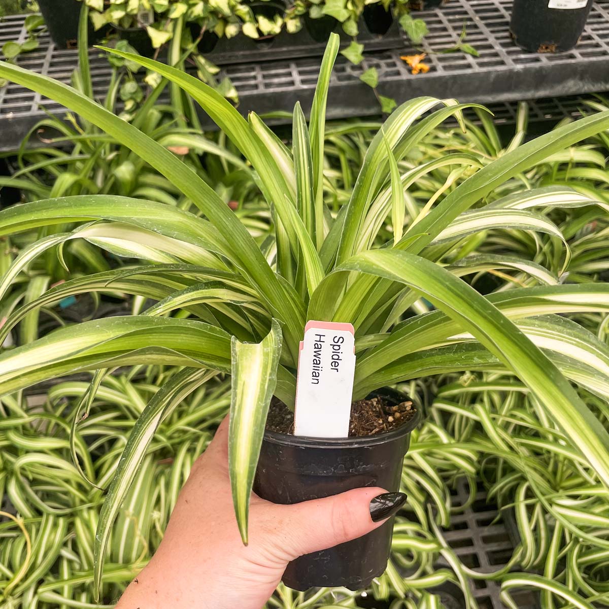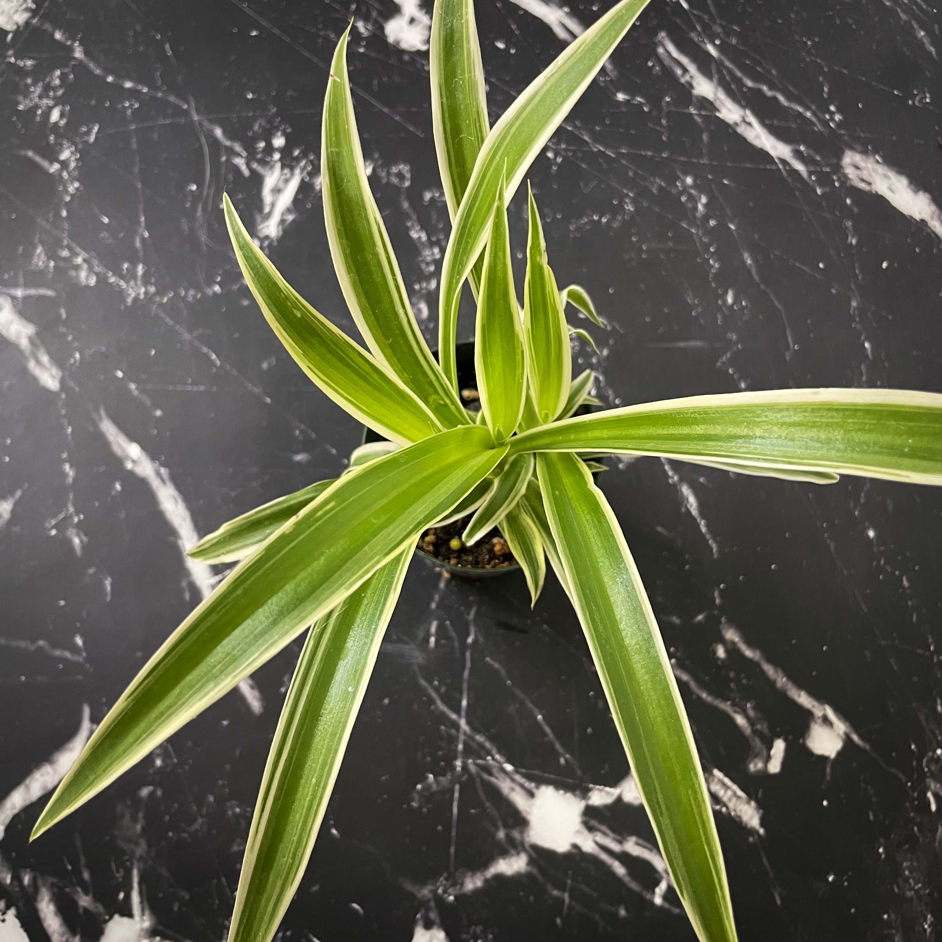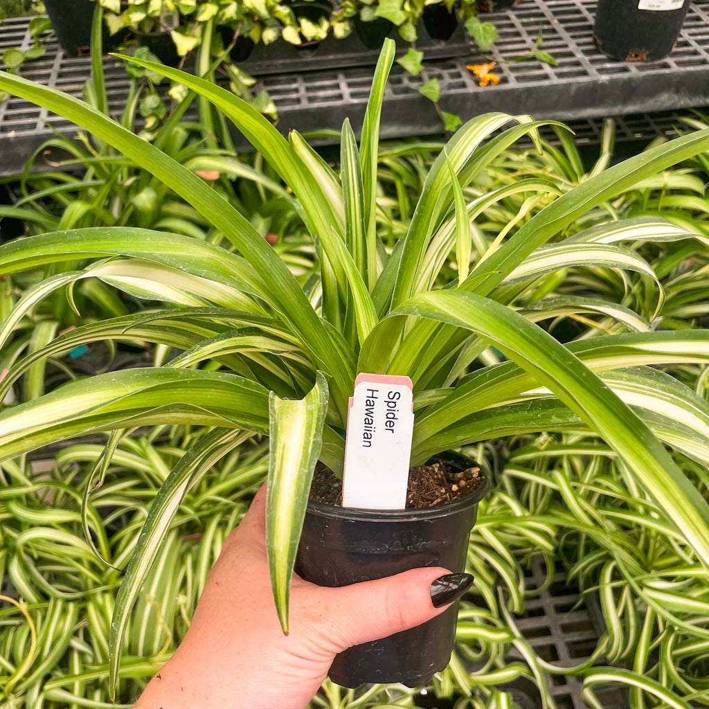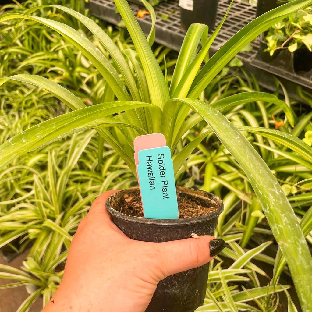 Hawaiian Spider Plant is an interesting variety that has variegation on its new leaves; as the leaves age, the variegation fades -- giving this houseplant a multicolor look.