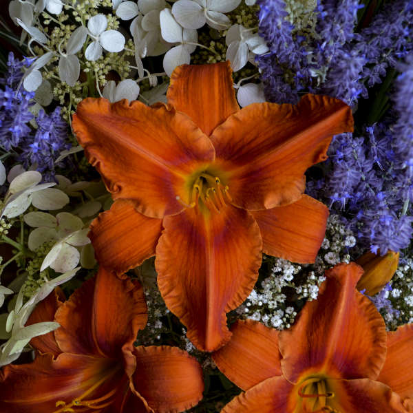 Huge 7", fiery red-orange flowers with a deeper red band and gold throat. Sculpted petals are delightfully ruffled and are of good substance, holding up well in the hot summer sun.