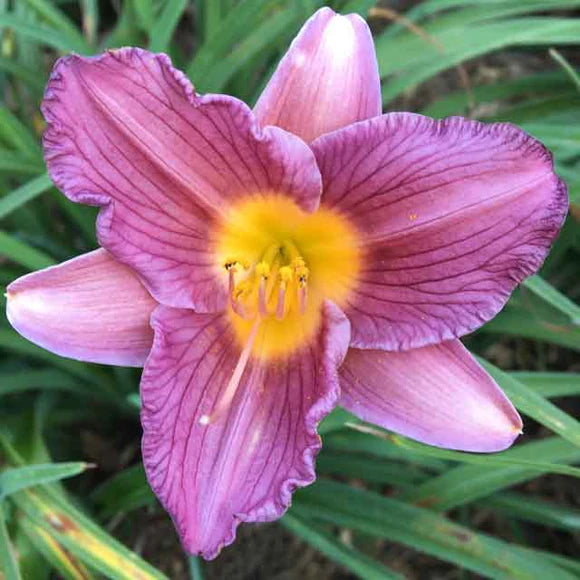 A miniature daylily with a compact growth habit; the perfect size for containers. Petals have narrow pie crust edges, dark purple veining, and paler purple midribs; smooth-edged sepals have white tips. Also known as 'Razzmatazz'