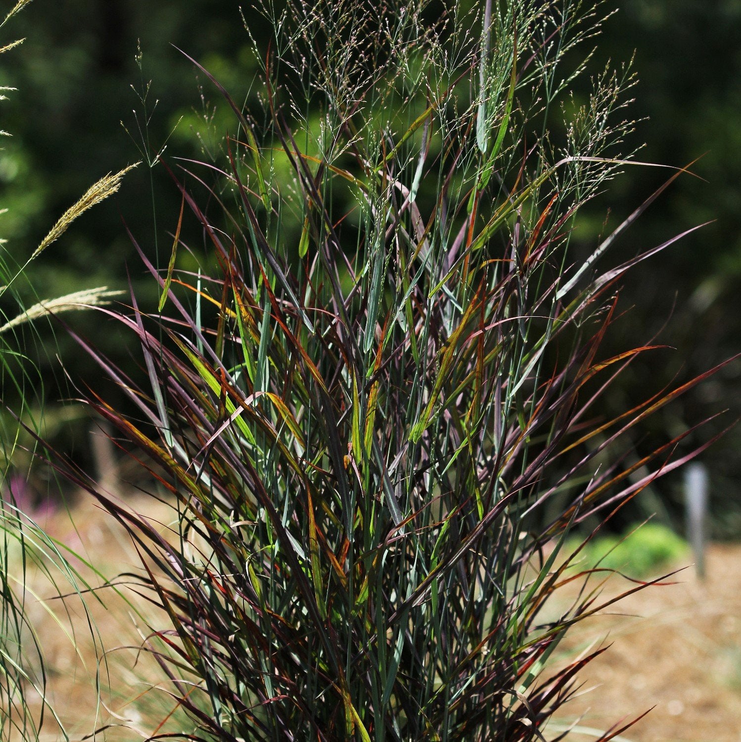 A compact, drought and salt tolerant, clumping grass with excellent vertical form. Blue-green foliage during the growing season turns a deep burgundy in summer. Airy purple flower panicles produce showy seed heads that provide winter interest.
