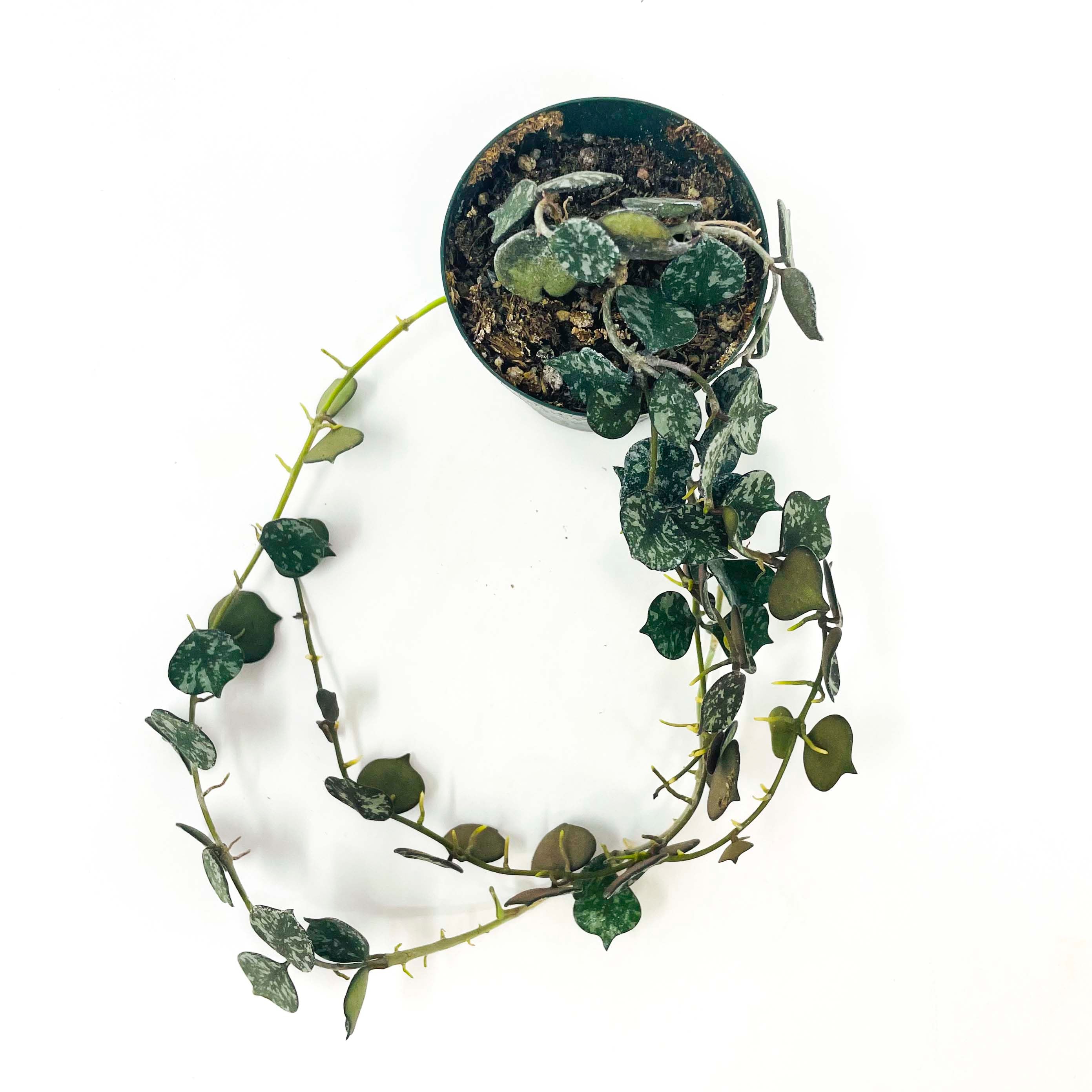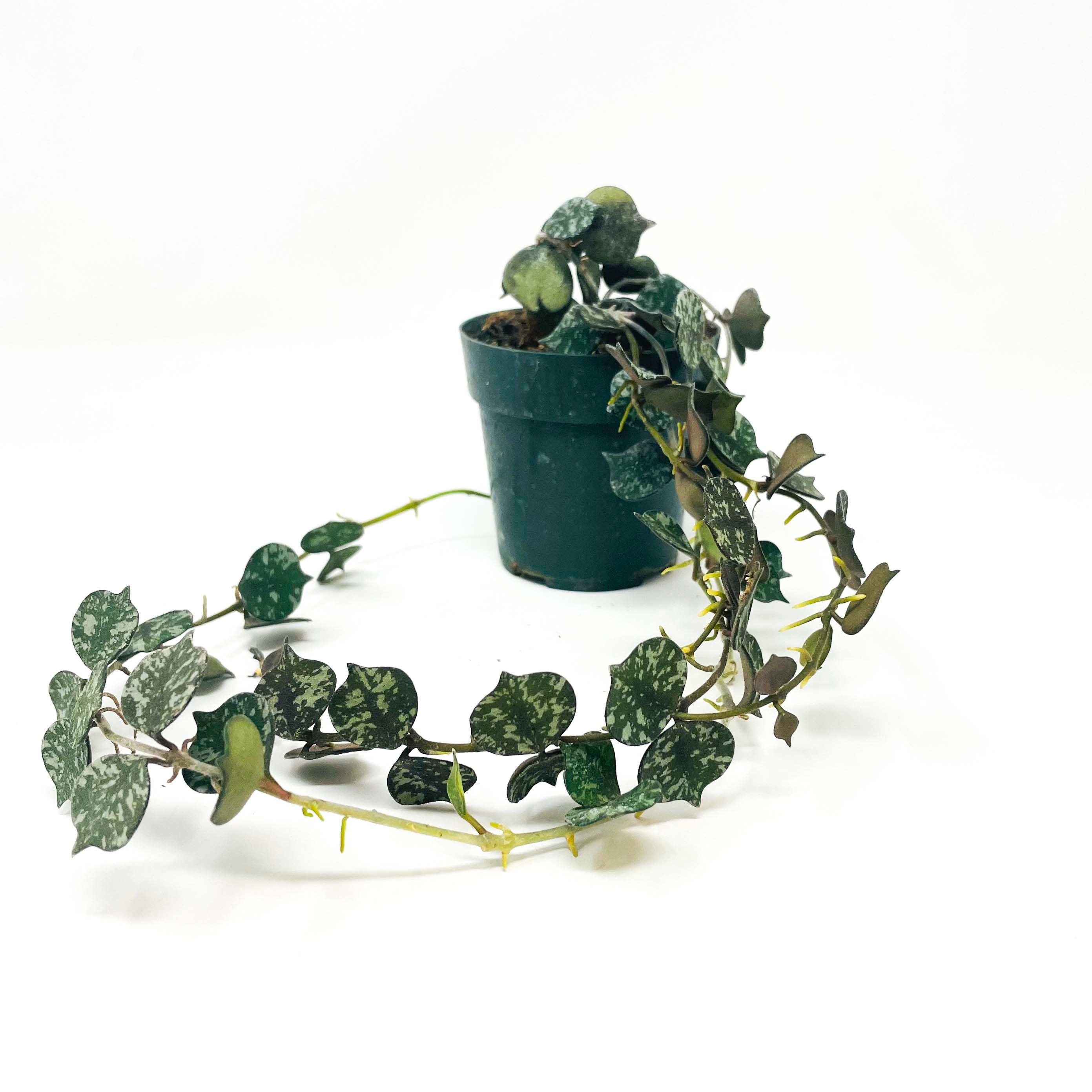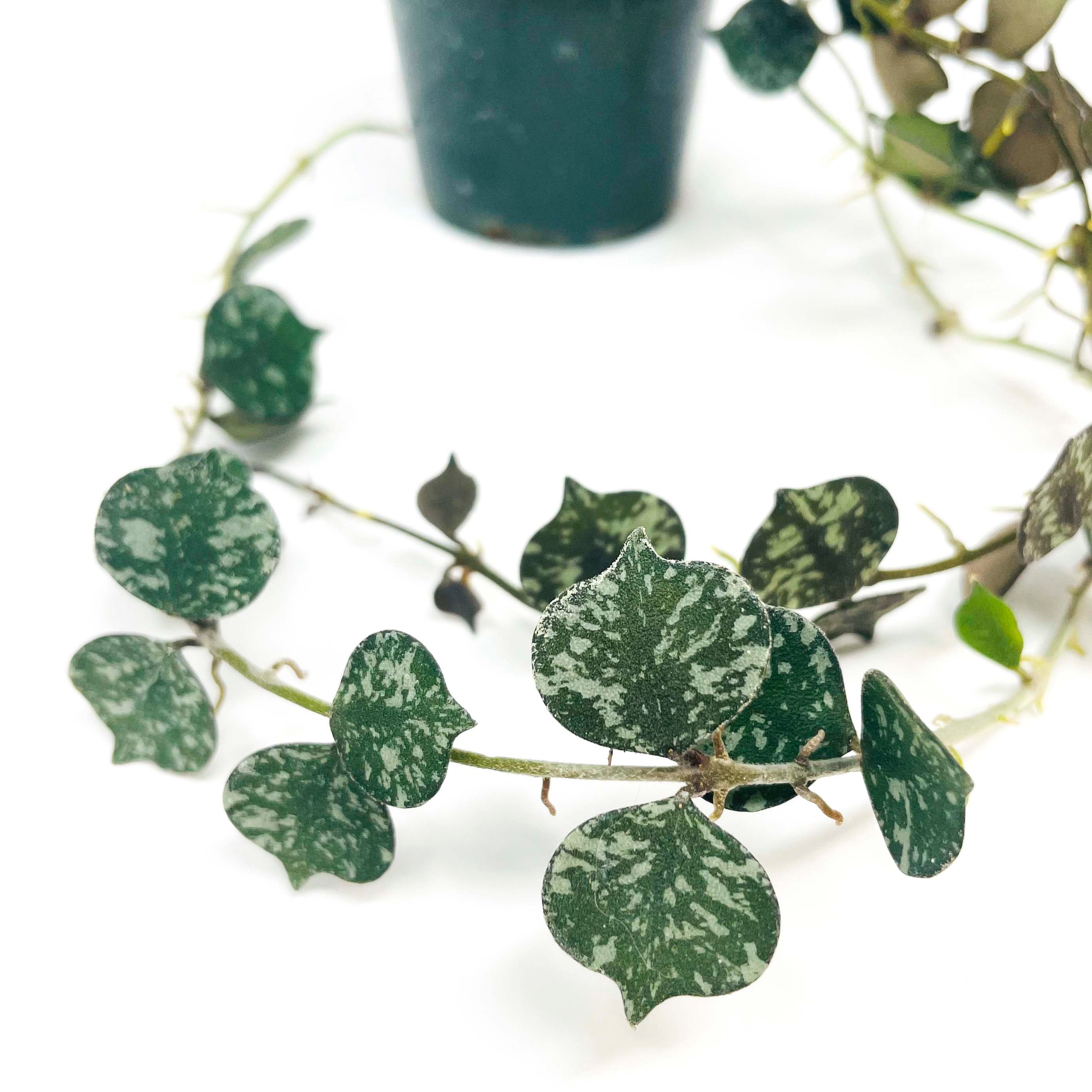 Hoya curtisii is a miniature, trailing variety with tiny, olive green, spade shaped leaves covered in silvery flecks.