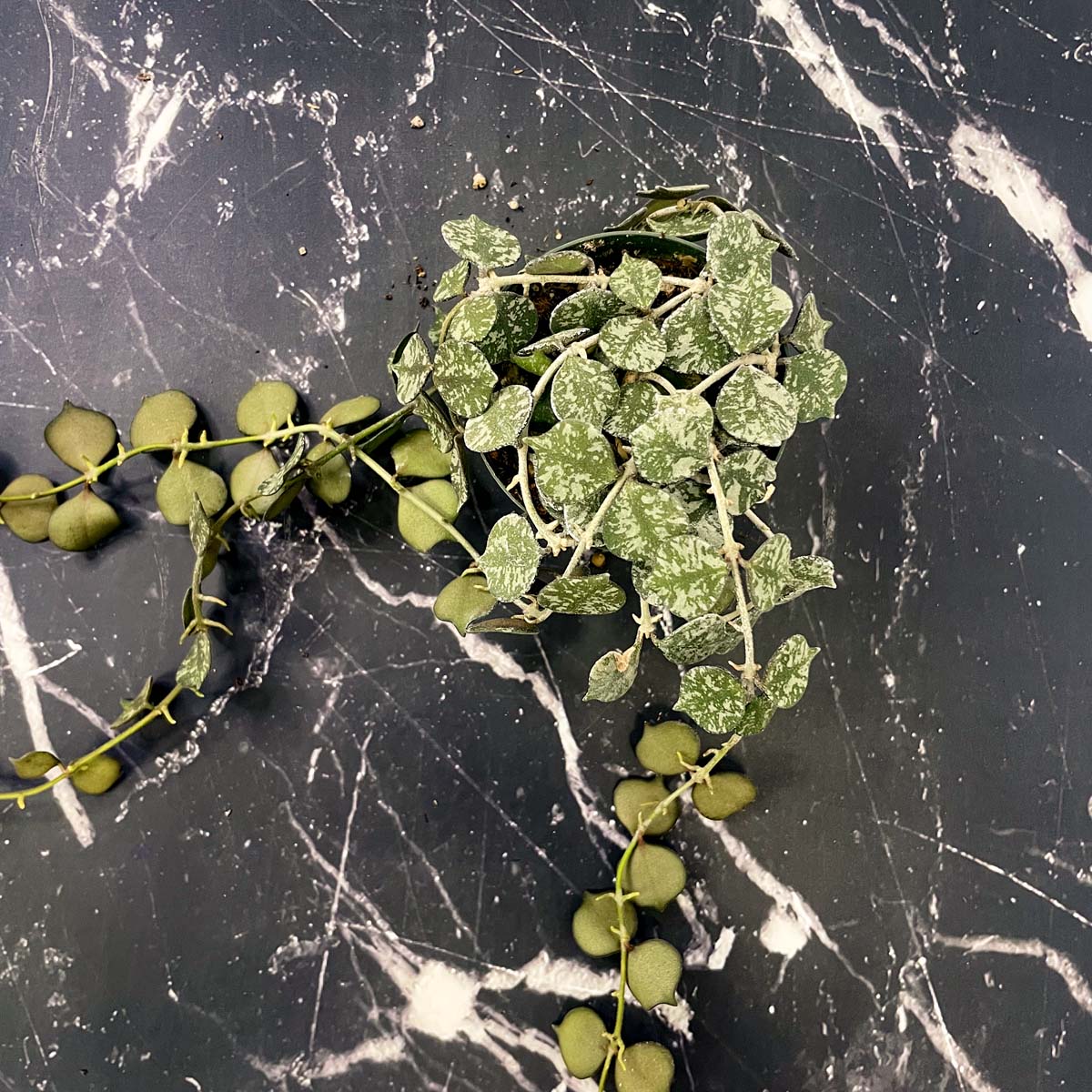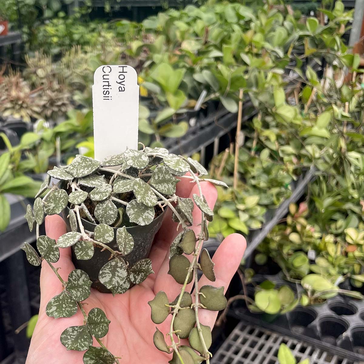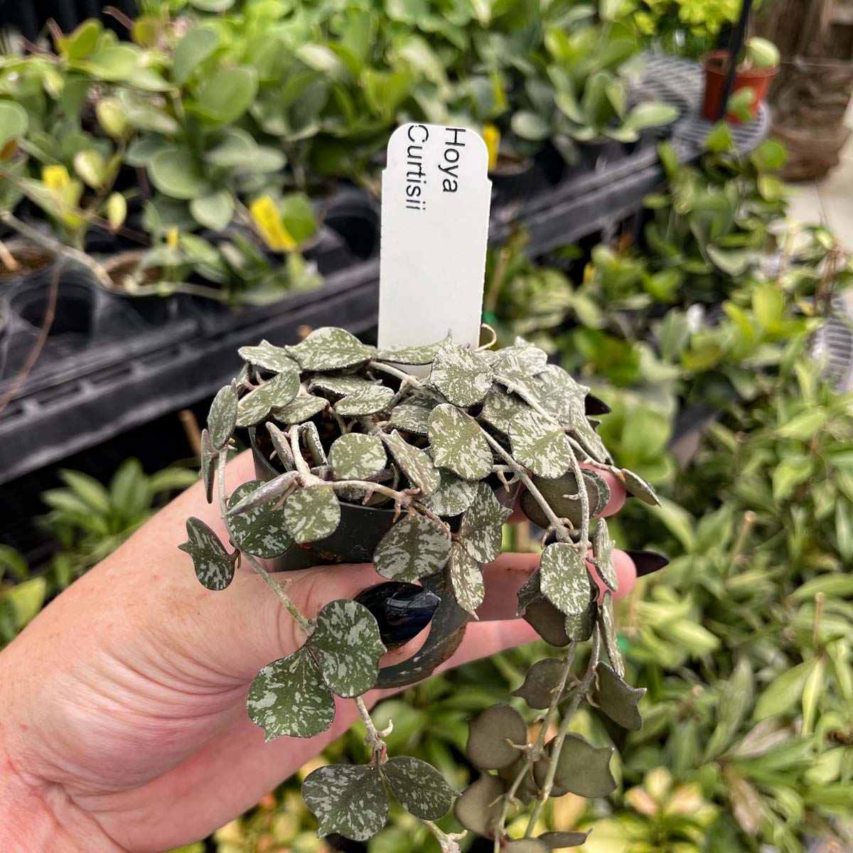 Hoya curtisii is a miniature, trailing variety with tiny, olive green, spade shaped leaves covered in silvery flecks.