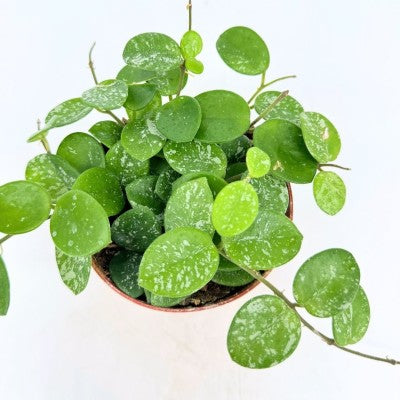 Say hello to ‘Mathilde Splash’, a stunning hybrid hoya with no shortage of freckles and speckles! ‘Mathilde’ sends out dainty vines of ovate, succulent leaves of medium green that are heavily splashed with spots of silver. ‘Mathilde’ is known for its easy-going nature, growing quickly for beginners and seasoned plant parents alike. Given the right conditions, 'Mathilde' will reward you with clusters of fragrant, fuzzy white flowers. Be sure to leave the spent flower peduncles intact, as this variety of hoya is a rebloomer.