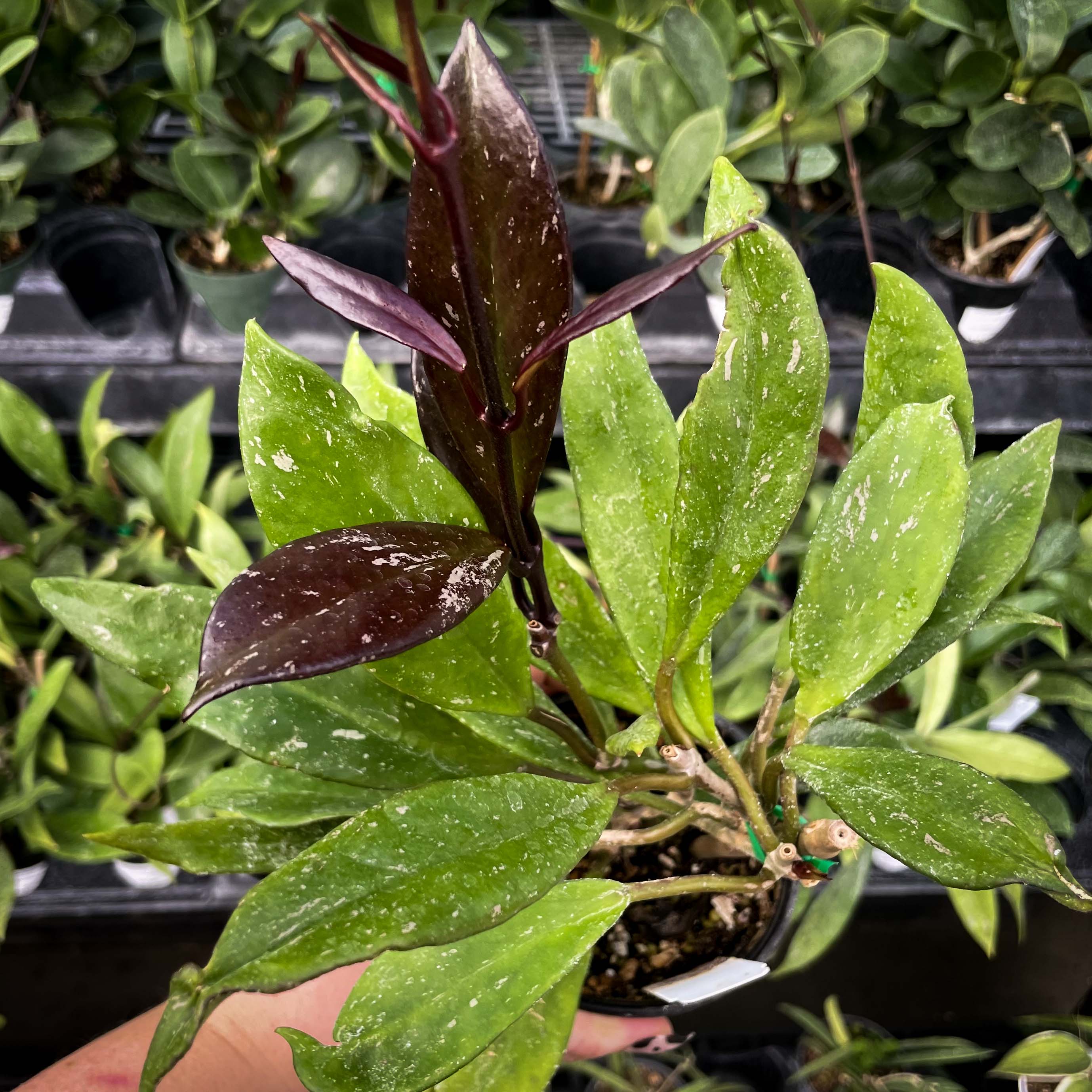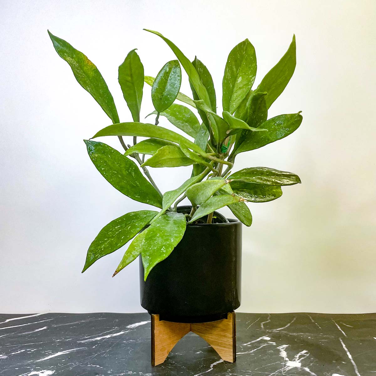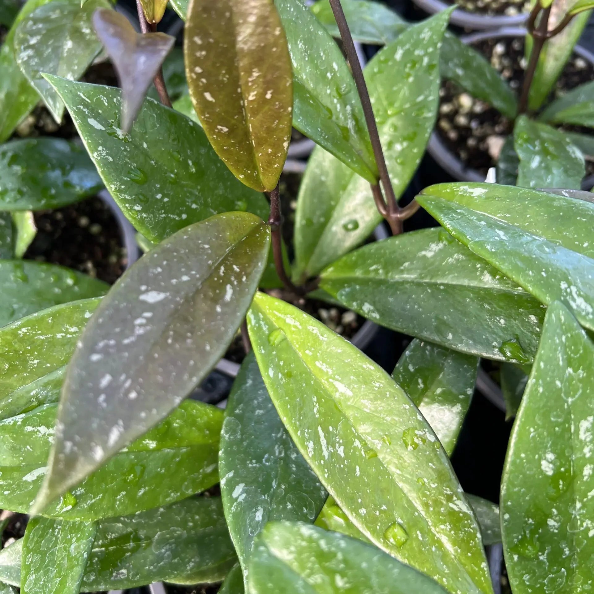 Hoya pubicalyx is a trailing houseplant featuring thick, glossy green, oval leaves with pointed tips and a black margin, hence the name. It produces waxy, ball clusters of whitish yellow flowers with reddish purple centers.
