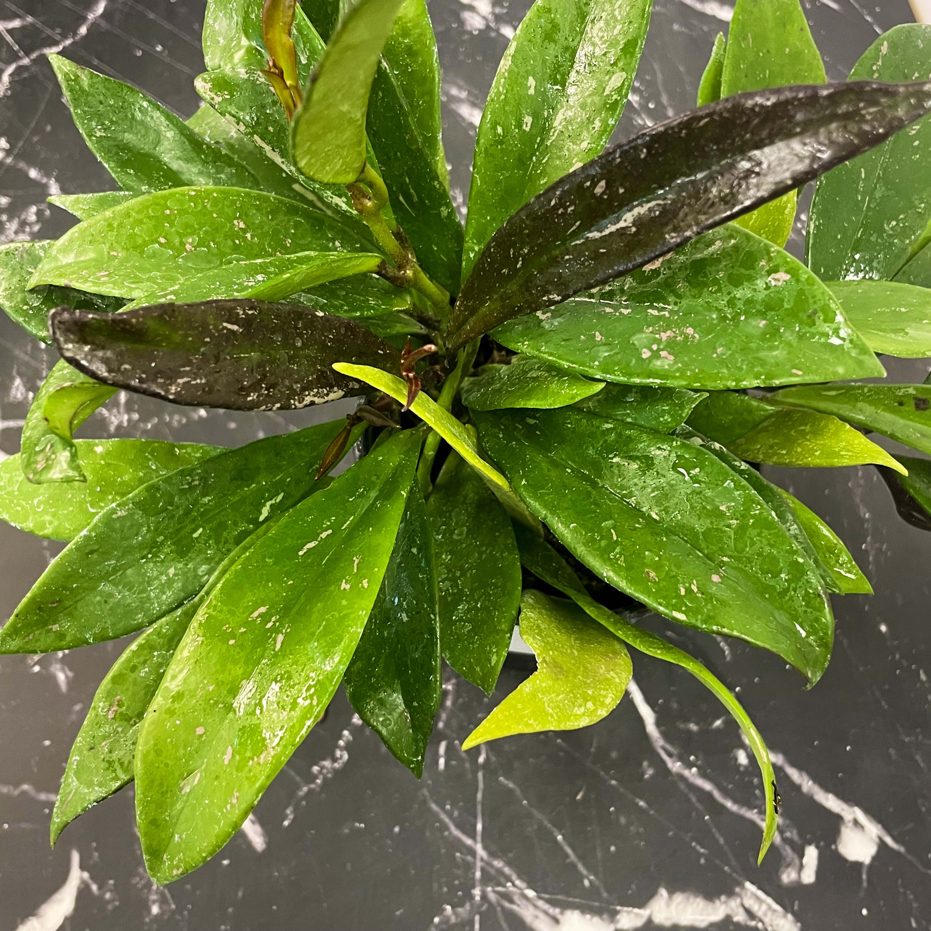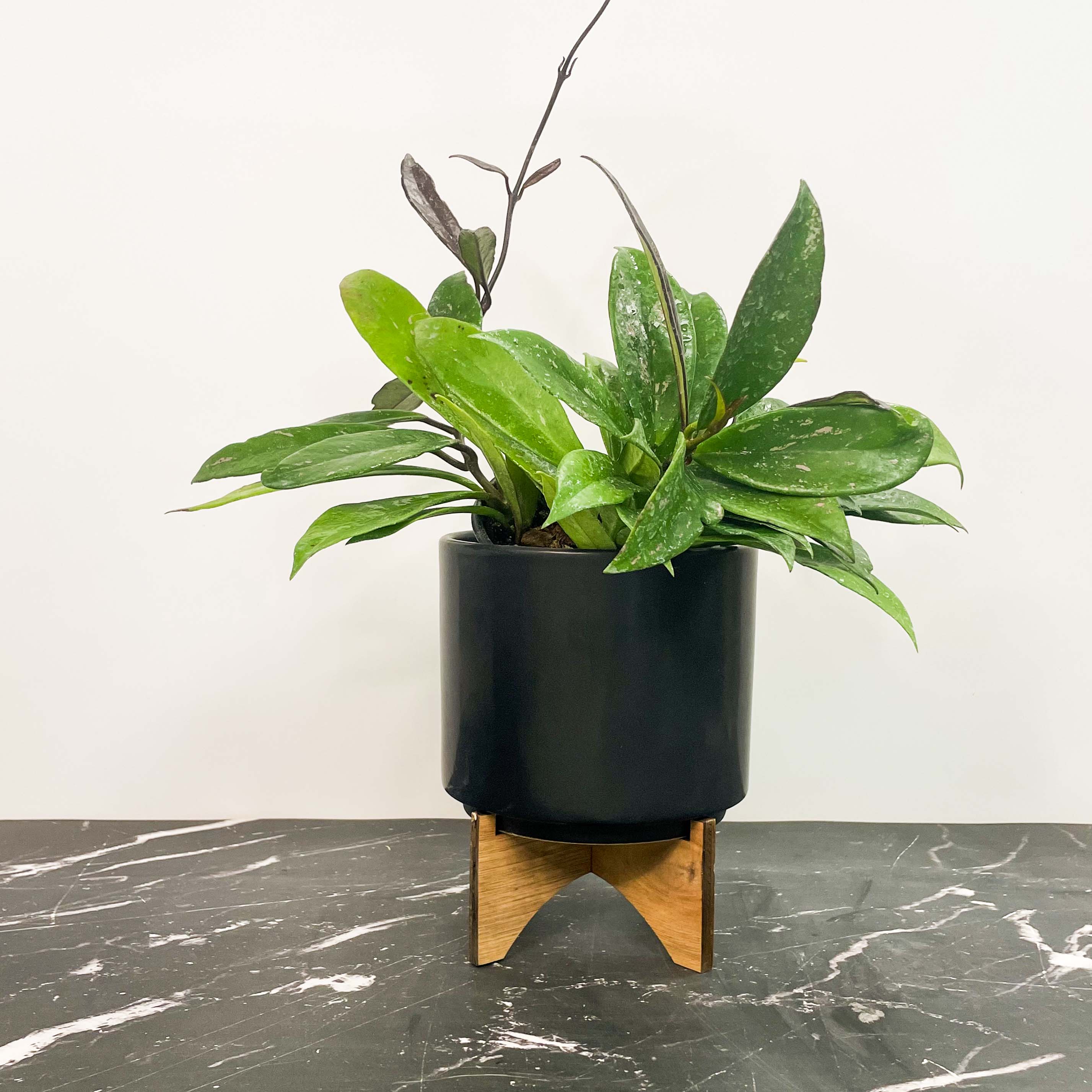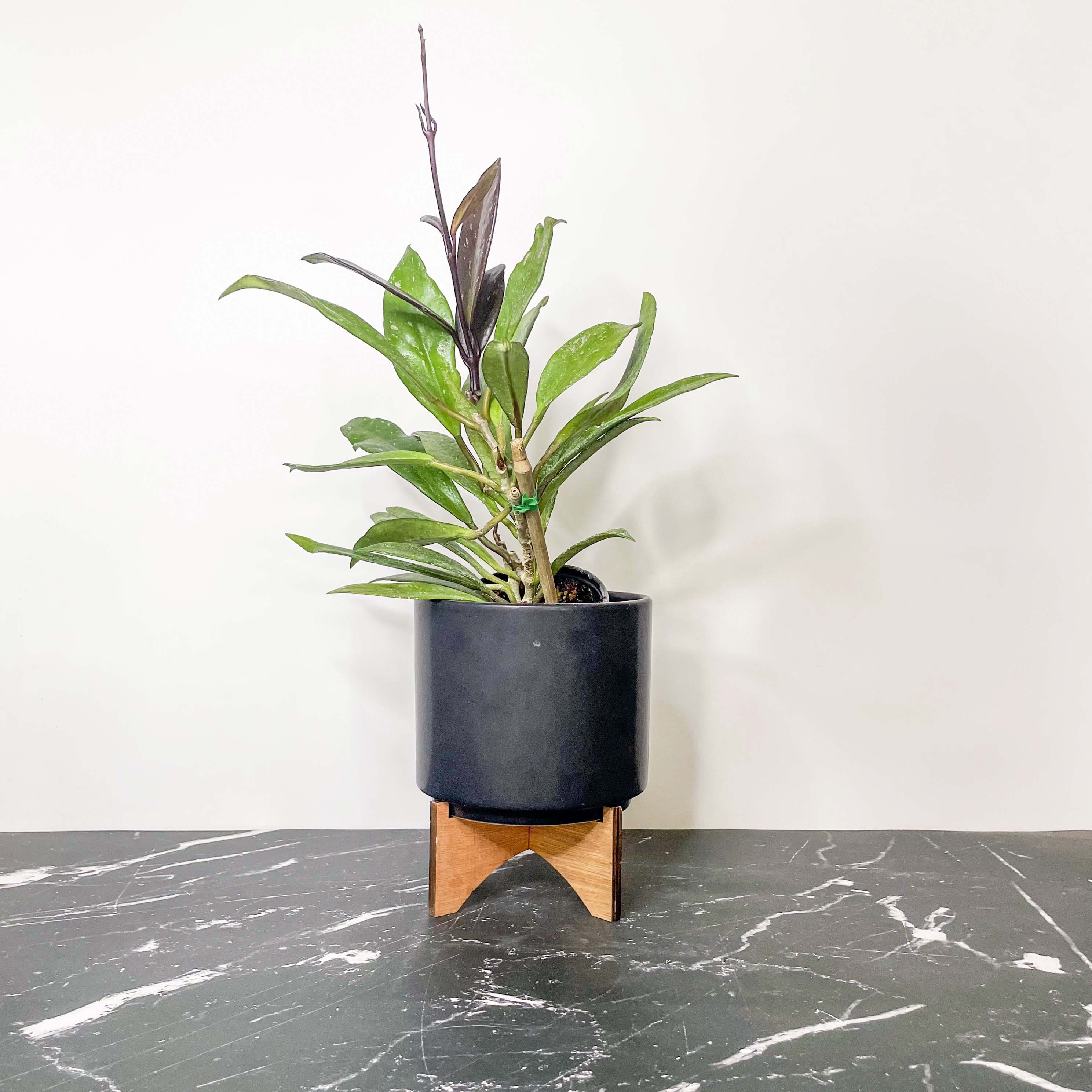 Hoya pubicalyx is a trailing houseplant featuring thick, glossy green, oval leaves with pointed tips and a black margin, hence the name. It produces waxy, ball clusters of whitish yellow flowers with reddish purple centers.