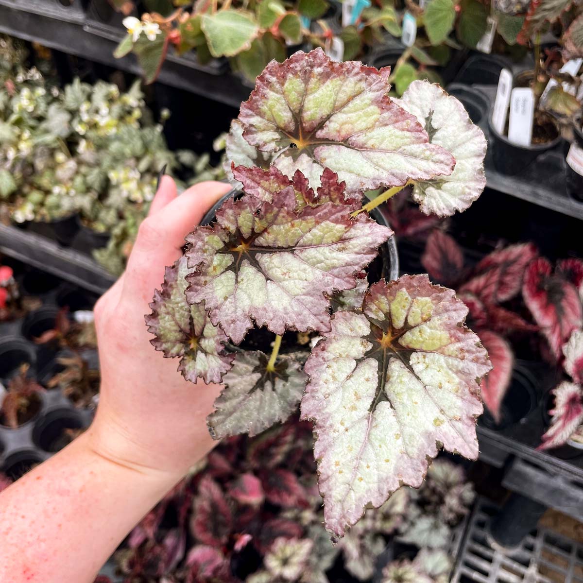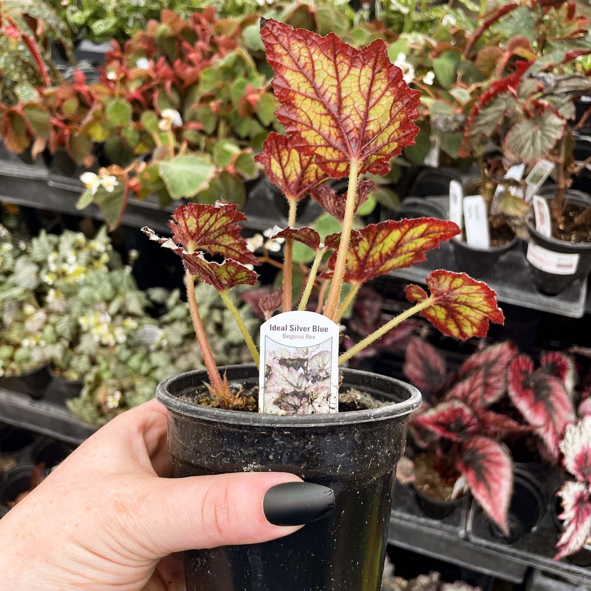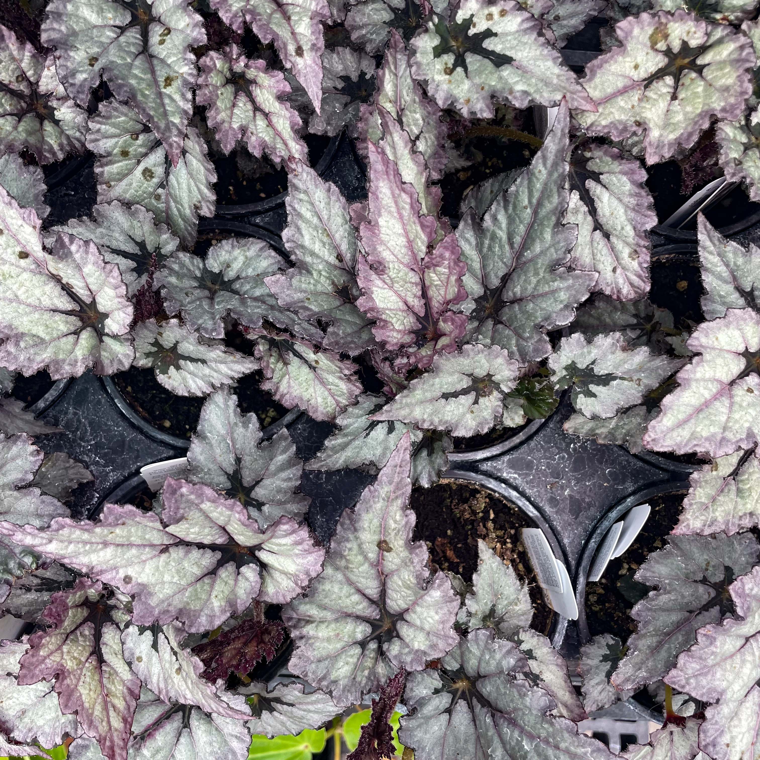 Ideal Silver Blue features purple leaves with a silver-green center swirl. Blooms clusters of dangling flowers.