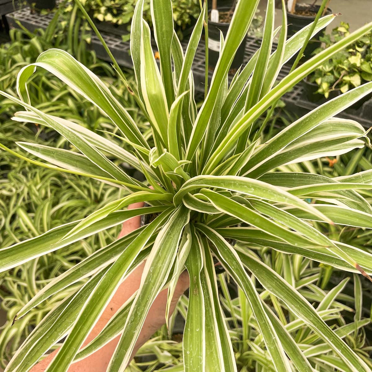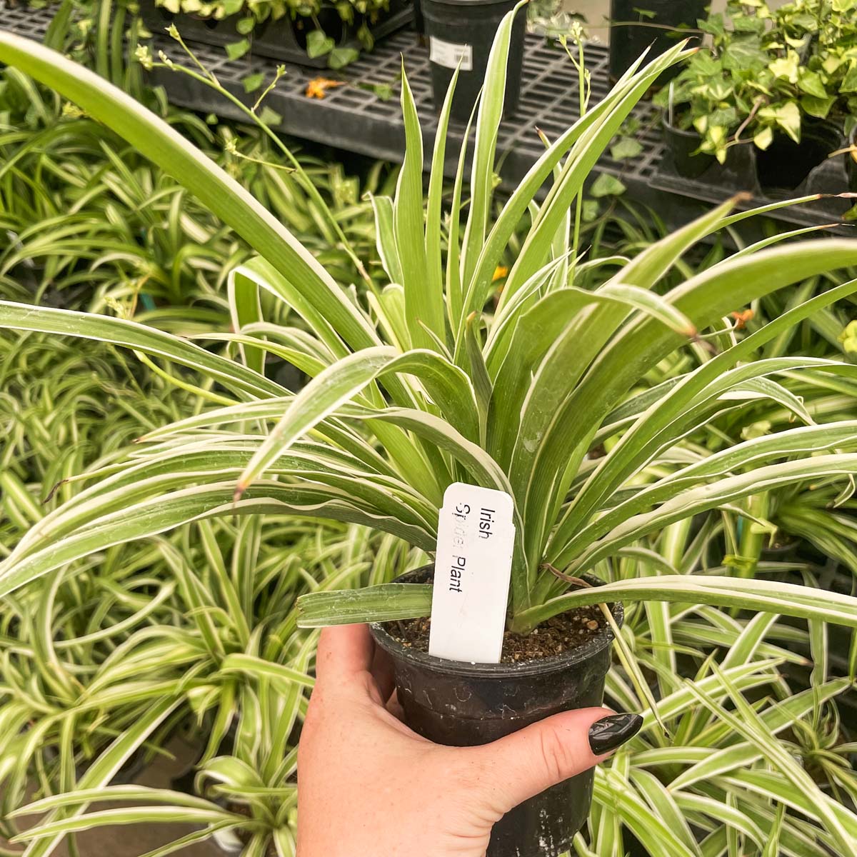 The Irish Spider Plant is a compact variety that features wider and shorter leave and reversed variegation than the common spider plant.