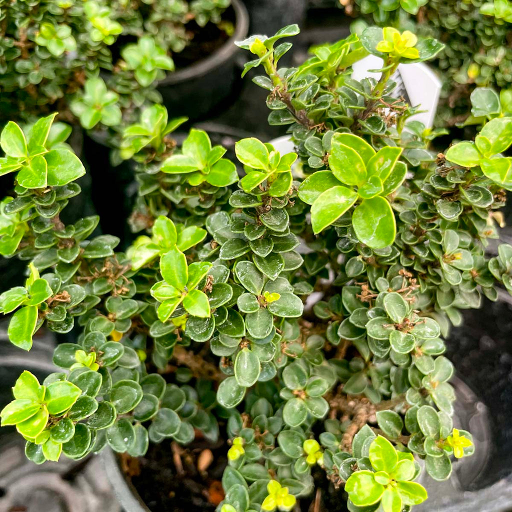 ‘Jersey Jewel’ is a distinctive Japanese holly cultivar characterized by tiny, deep green, oval leaves that gently cup and arrange themselves in a unique layered pattern. Each set of leaves alternates at a 90° angle on short, stiff branches, creating an eye-catching, architectural form. With an irregular yet structured habit, it provides a striking companion to dwarf conifers and other refined garden elements.