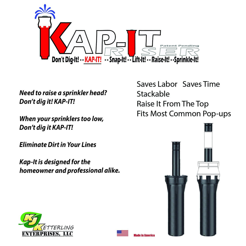 Product Description:  KAP-IT allows anyone to raise a sprinkler head from the top instead of from the bottom. By extending the stem of a standard riser, you have raised the height. The new snap on top protects the stem extension, while leaving all of manufacturer's original parts completely intact. KAP-IT keeps the rocks and debris normally introduced into the head when a sprinkler is unscrewed below ground. The snap on top is designed to still allow regular access to the inside of the head itself, by maintaining the ability to unscrew the top of the canister with the KAP-IT, even when more than one is stacked. Simple, Secure, Fast and Permanent jump up your nozzle with a KAP-IT.