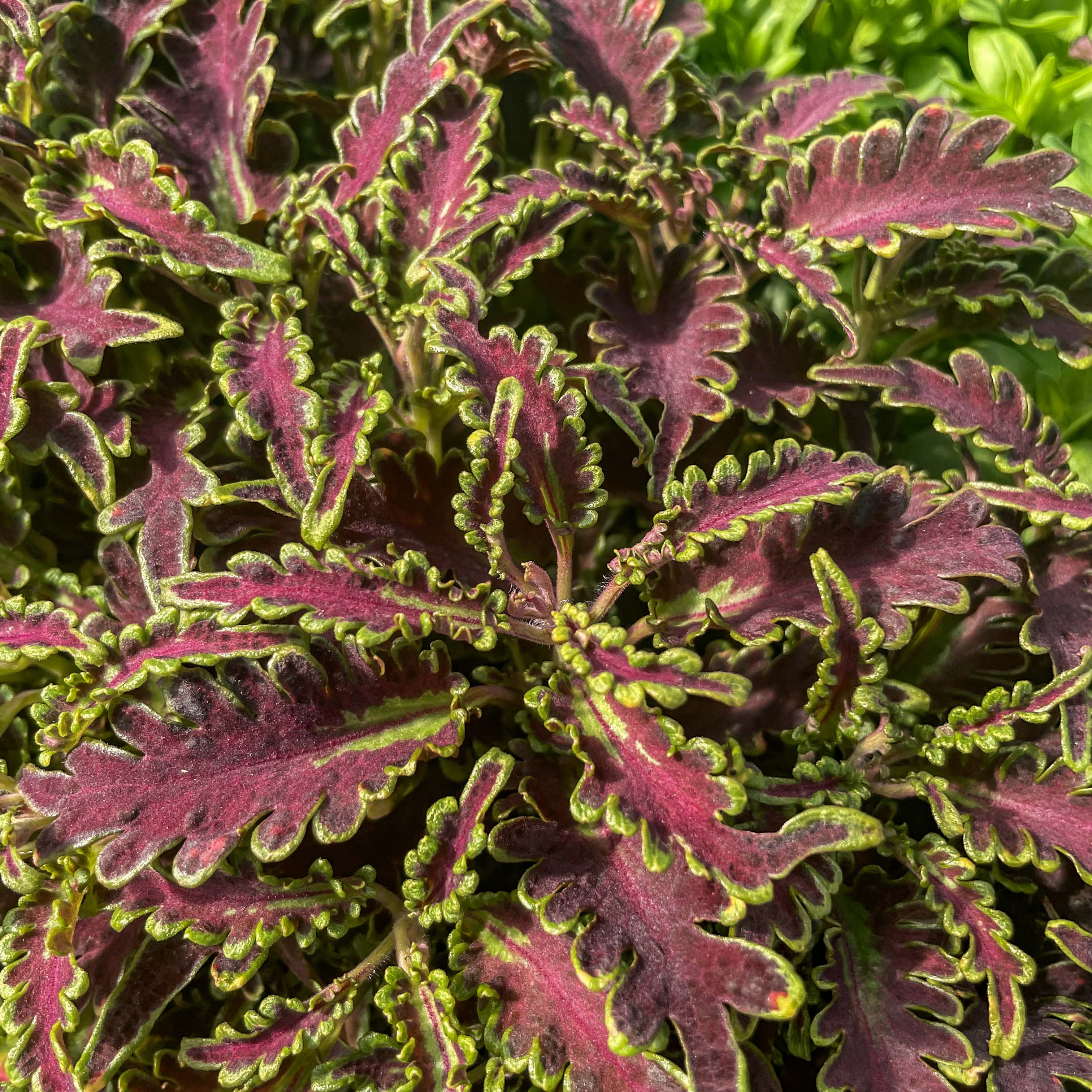 Kiwi Fern is favored for its unusual, airy quality, this coleus has narrow, frilly leaves that are dark purple and red with yellow highlights at the edge. Great for pots, hanging baskets, and window boxes.