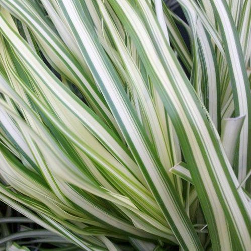 Foliage has wide creamy white center stripes that are edged in green, a different twist on your typical Calamagrostis variety; late summer plumes will persist through winter, if not cut back.