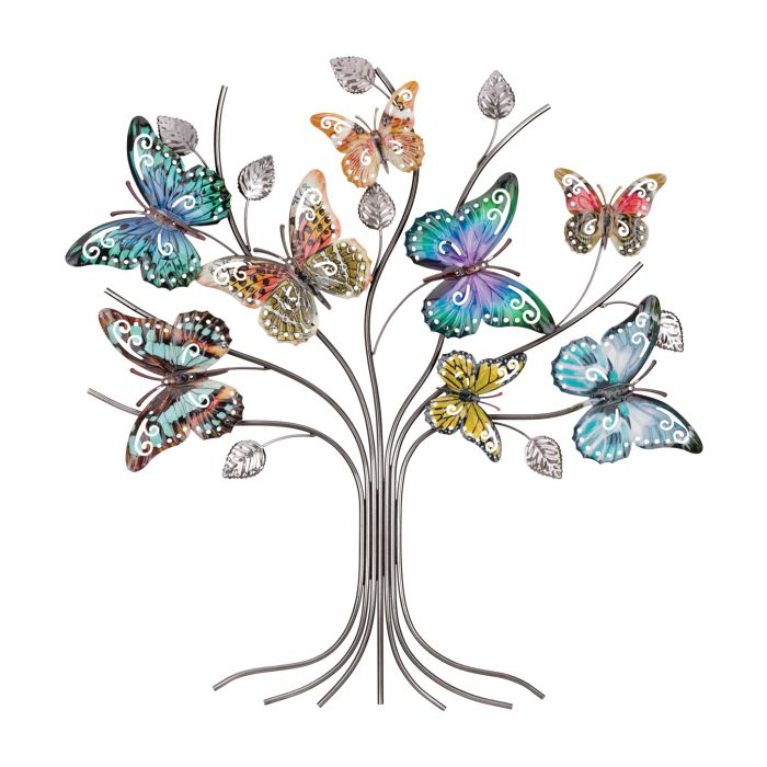 A bright silver trunk, branches and leaves form the main tree and brightly colored butterflies make the leaves. A special printing process on metal allows the butterflies to have detailed designs. Then a high gloss lacquer finish makes the whole piece shine.