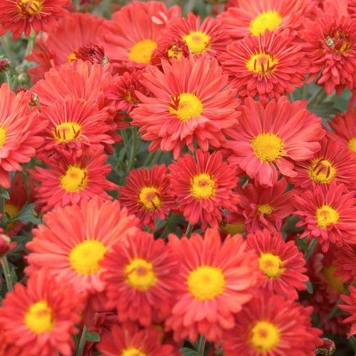 Mammoth Mums are blooming machines in late summer-fall, like a small shrub in size, this variety will be smothered in bronze-red daisy flowers with yellow centers, the ferny foliage stays green all season.