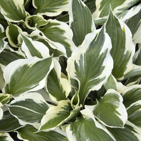 Among the showiest of hostas with its attractive, wide, lightly cupped foliage. Satiny green leaves are surrounded by creamy white margins. Large, funnel-shaped flowers are dark lavender. A sun tolerant selection. Ideal for adding exuberant color to shady gardens.