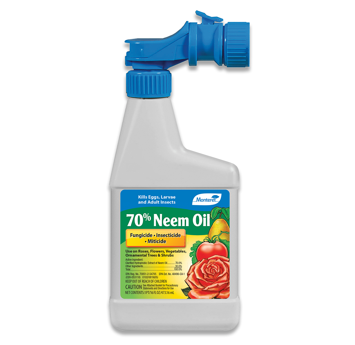 Monterey 70% Neem Oil is a multi-purpose fungicide, insecticide and miticide. Use on many types of plants ranging from vegetables, trees, shrubs, ornamentals, flowers, houseplants and more. Controls insects, mites and many diseases. It kills eggs, larvae and adult stages of insects, and prevents fungal attack of plant tissues.
