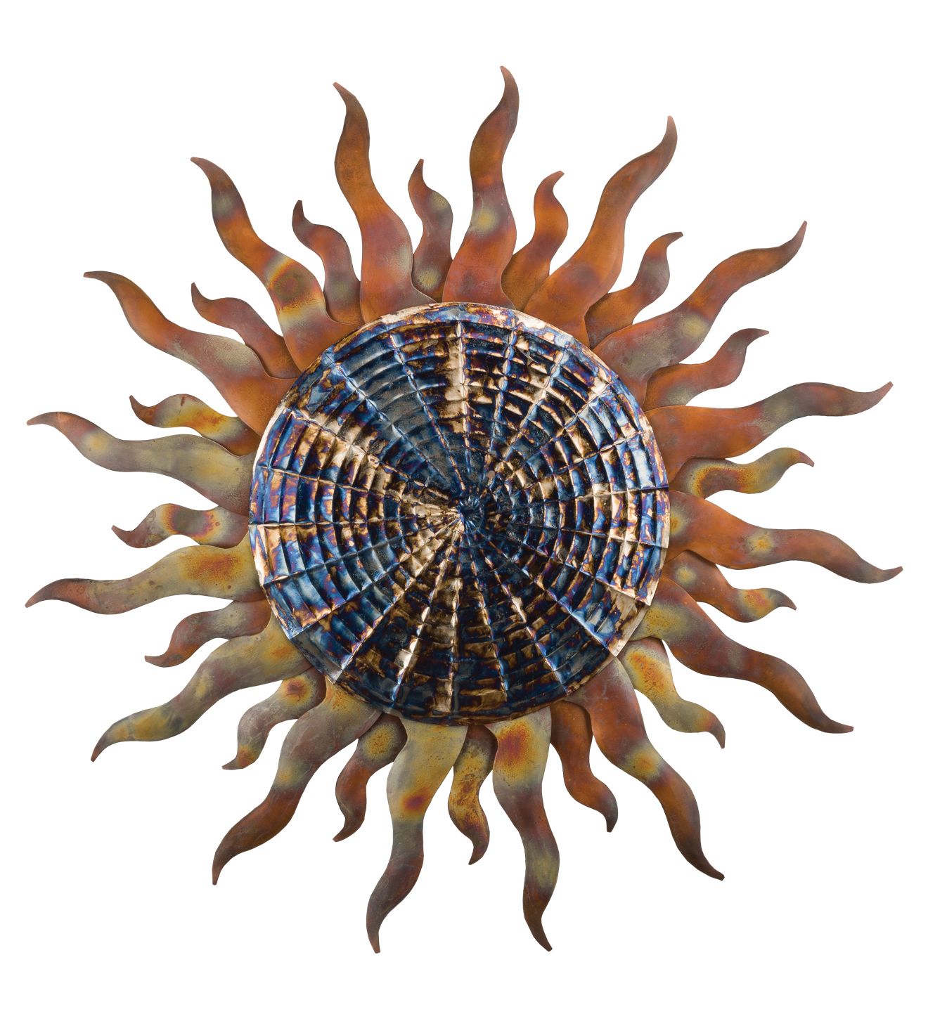 A truly uniquely designed Sun Wall Decor with multi-colored flamed copper rays and a textured center with deep blue and gold flamed coloration. The contrast of colors is stunning.