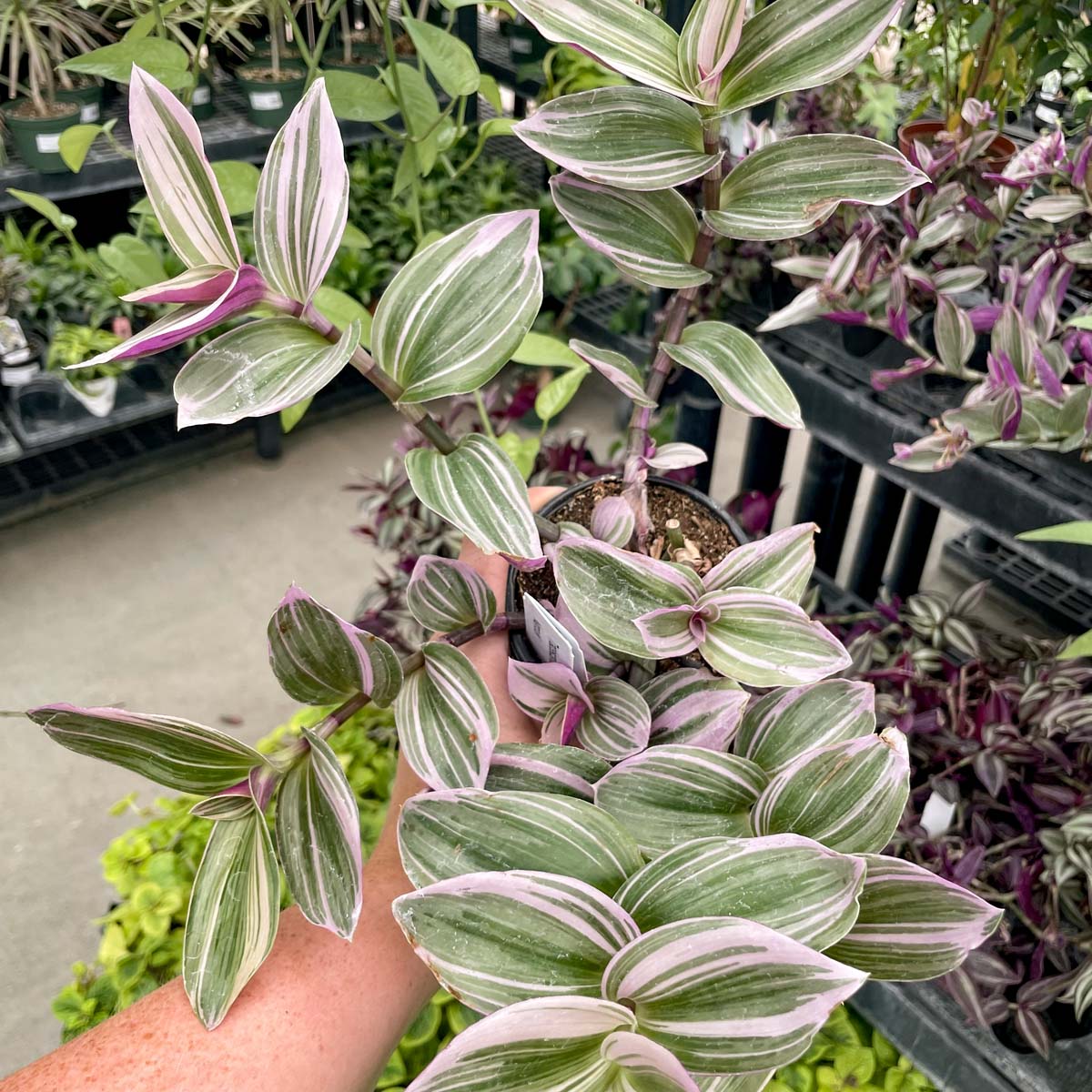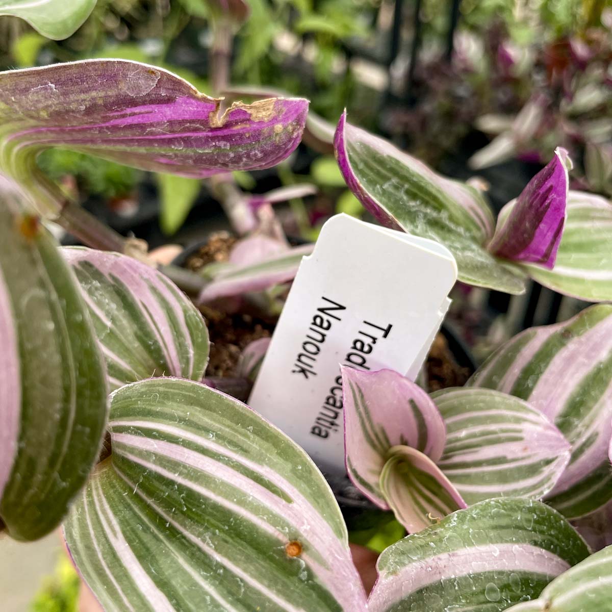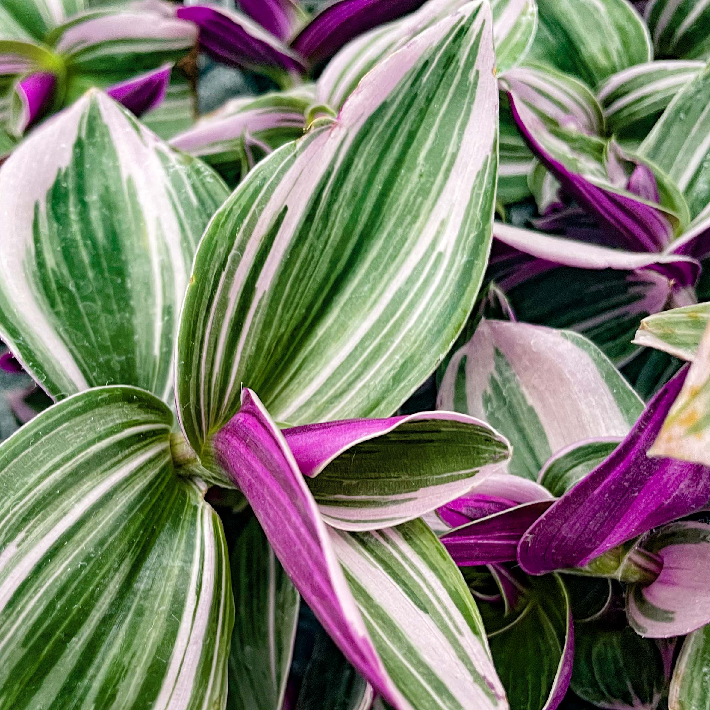 Tradescantia fluminensis ‘Nanouk,’ also known as Wandering Dude, showcases medium-green leaves striped with shades of cream and pink. The undersides of the foliage contrast beautifully in magenta-purple, creating a vibrant display from every angle. With relatively low care needs, ‘Nanouk’ thrives in bright light, making it a fantastic choice for desks and tabletops—or hang it up so you can admire its colorful backsides from below.
