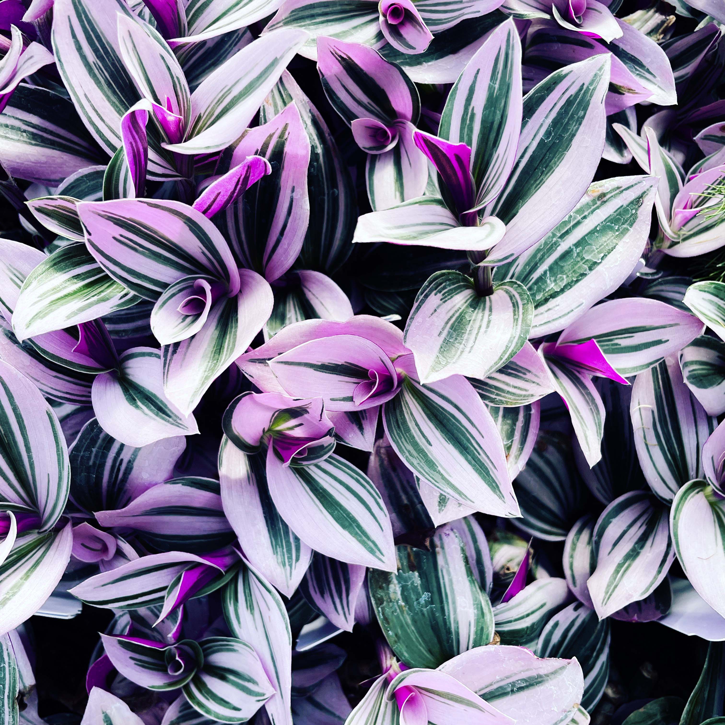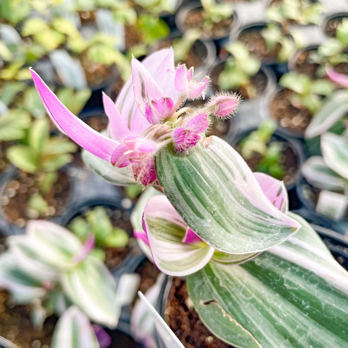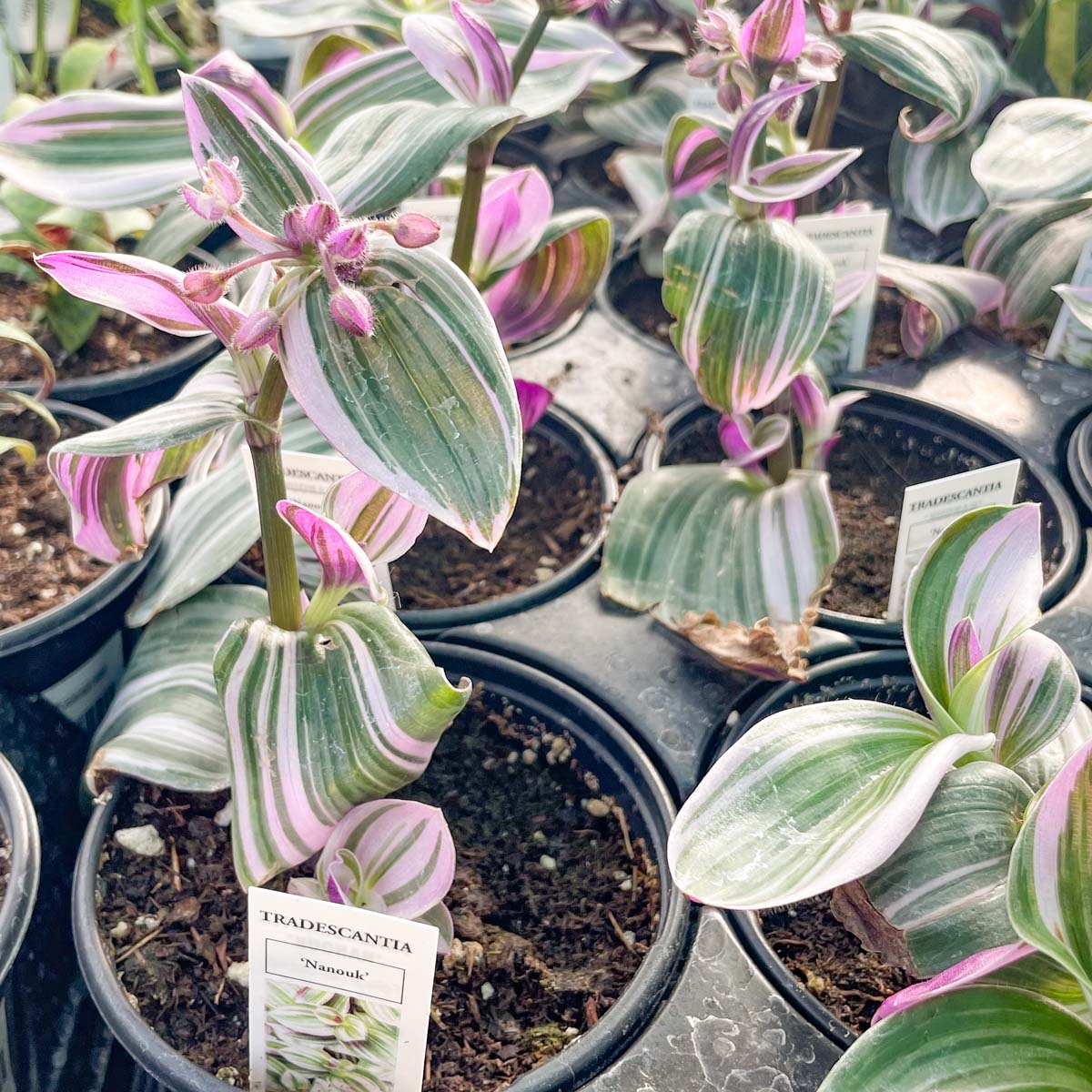 Tradescantia fluminensis ‘Nanouk,’ also known as Wandering Dude, showcases medium-green leaves striped with shades of cream and pink. The undersides of the foliage contrast beautifully in magenta-purple, creating a vibrant display from every angle. With relatively low care needs, ‘Nanouk’ thrives in bright light, making it a fantastic choice for desks and tabletops—or hang it up so you can admire its colorful backsides from below.