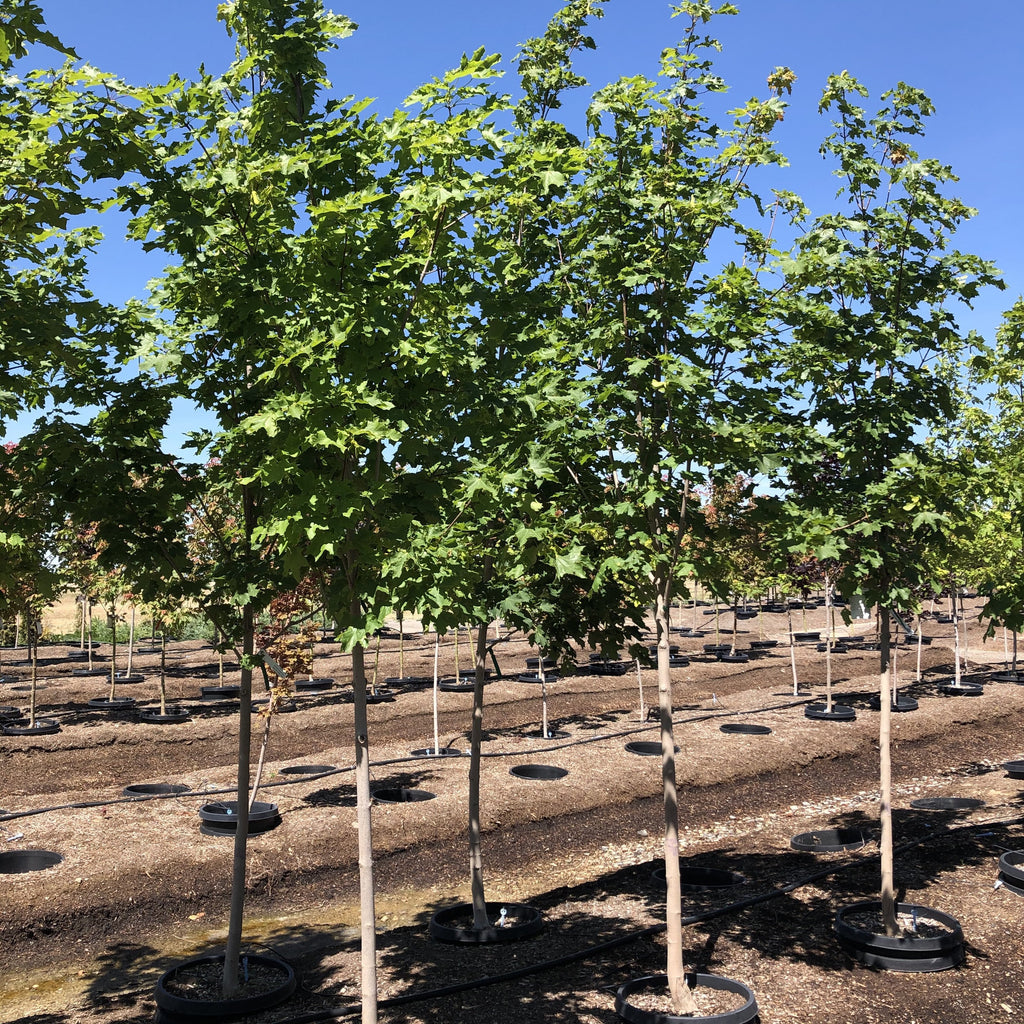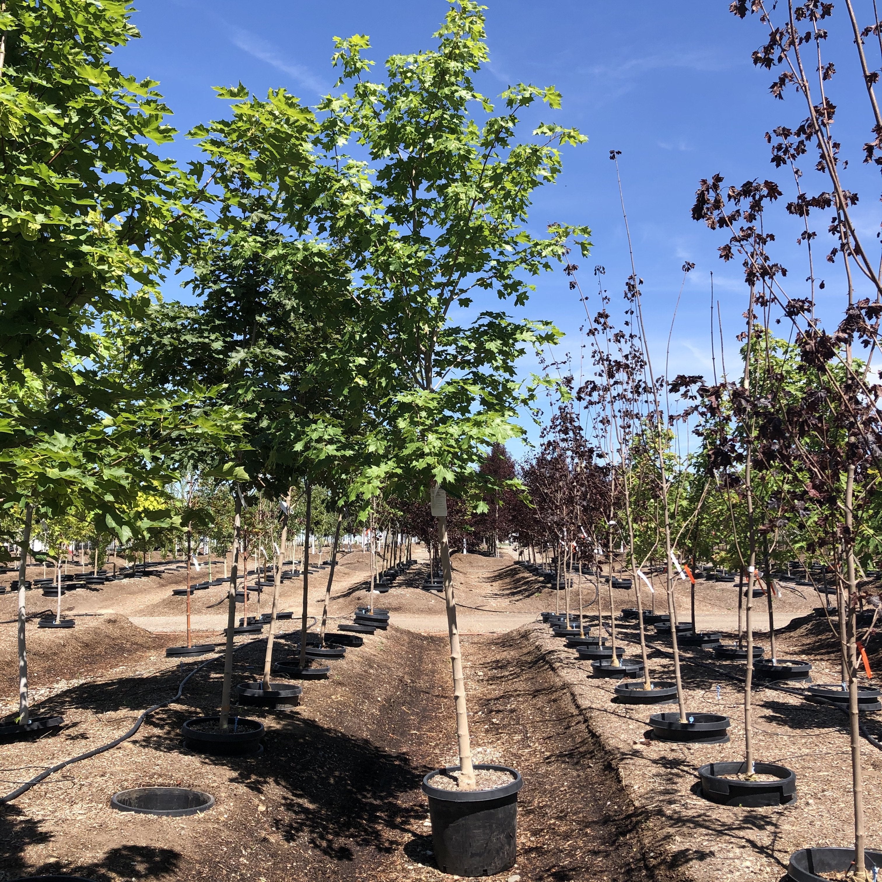 An upright oval tree with yellow-orange to red fall color. Norwegian Sunset® has a particularly nice branch structure and uniform canopy. Its Acer truncatum parentage gives glossy foliage and heat resistance.