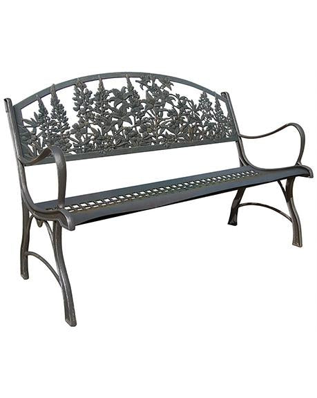 The Painted Sky Park Bench is made of cast iron with a maintenance-free powder coat bronze finish and hand-painted highlights. There are only four parts, making assembly a breeze.