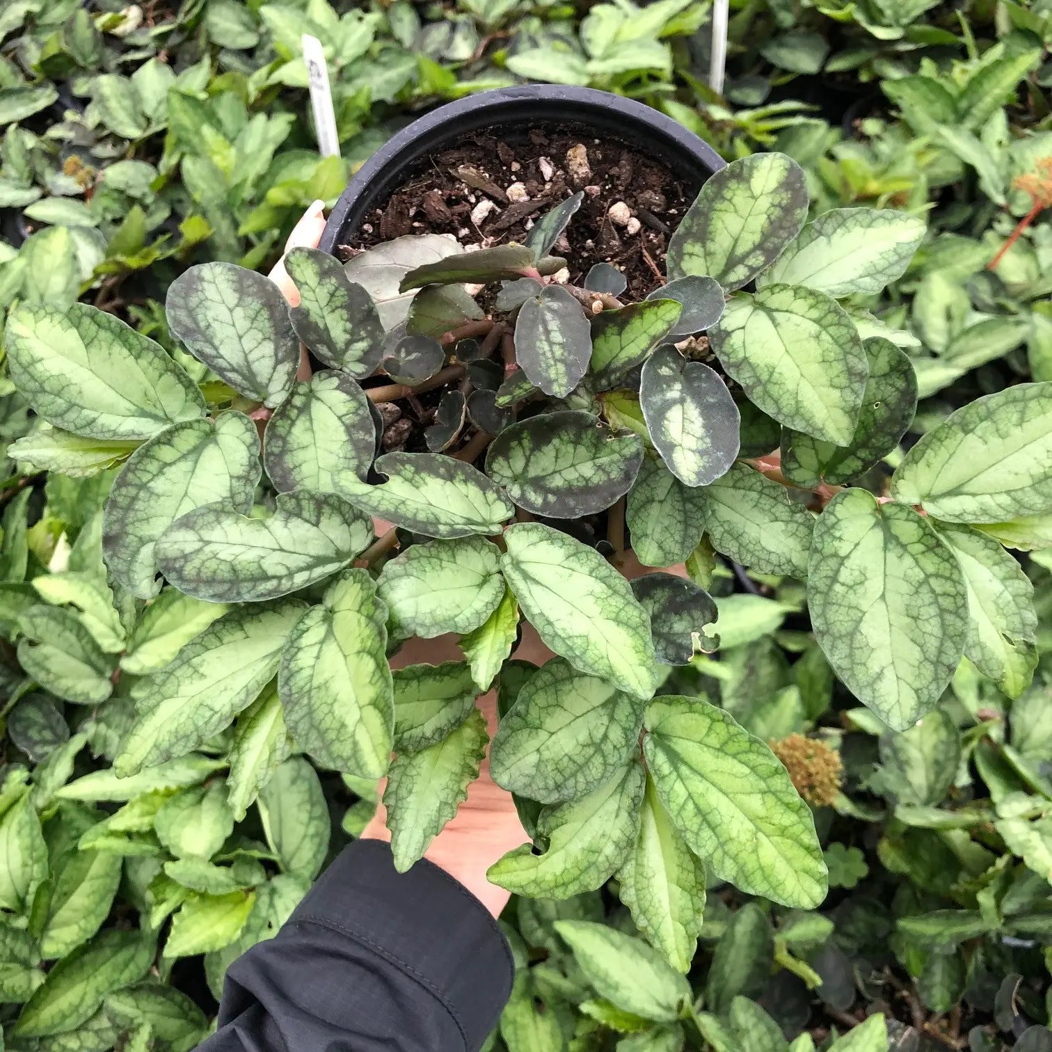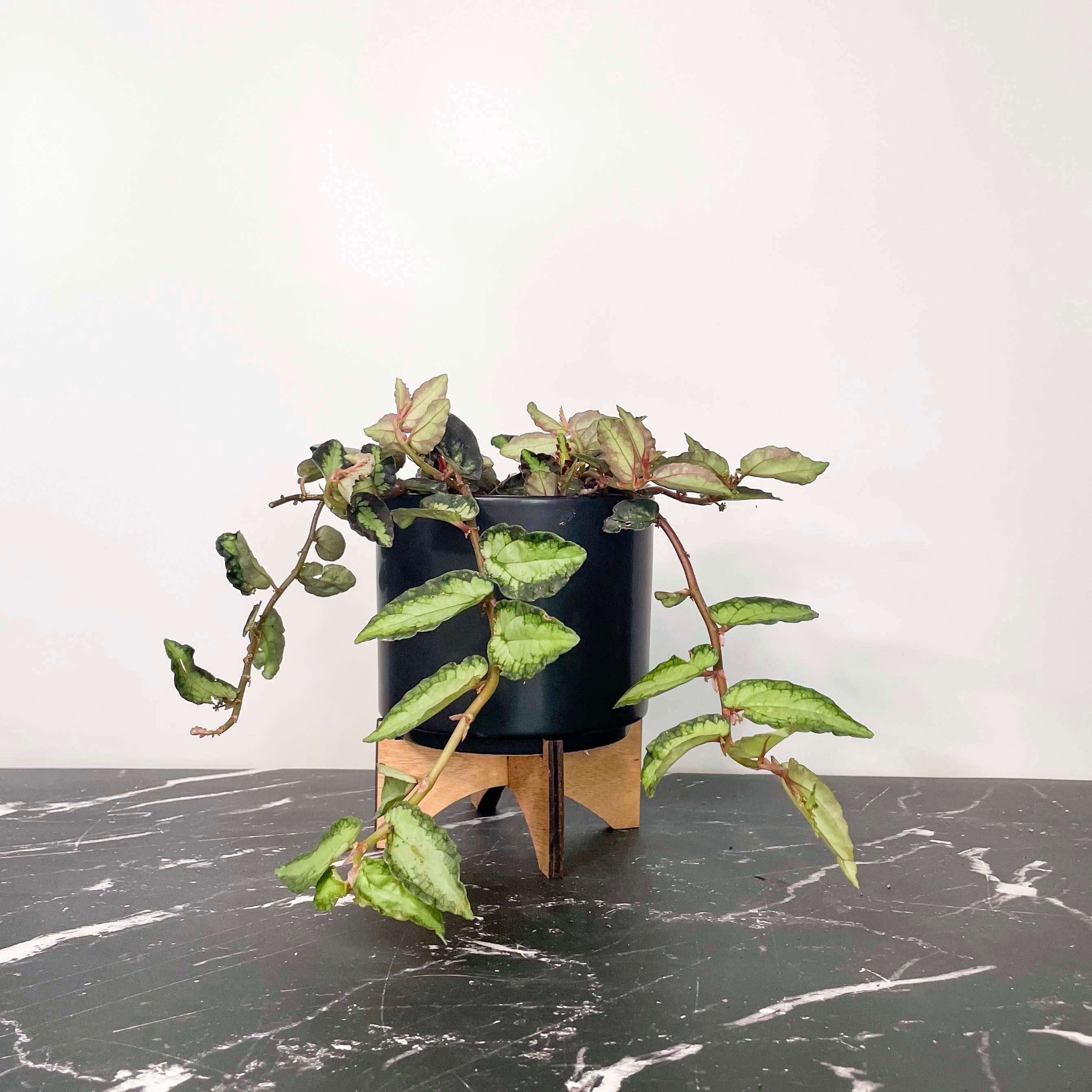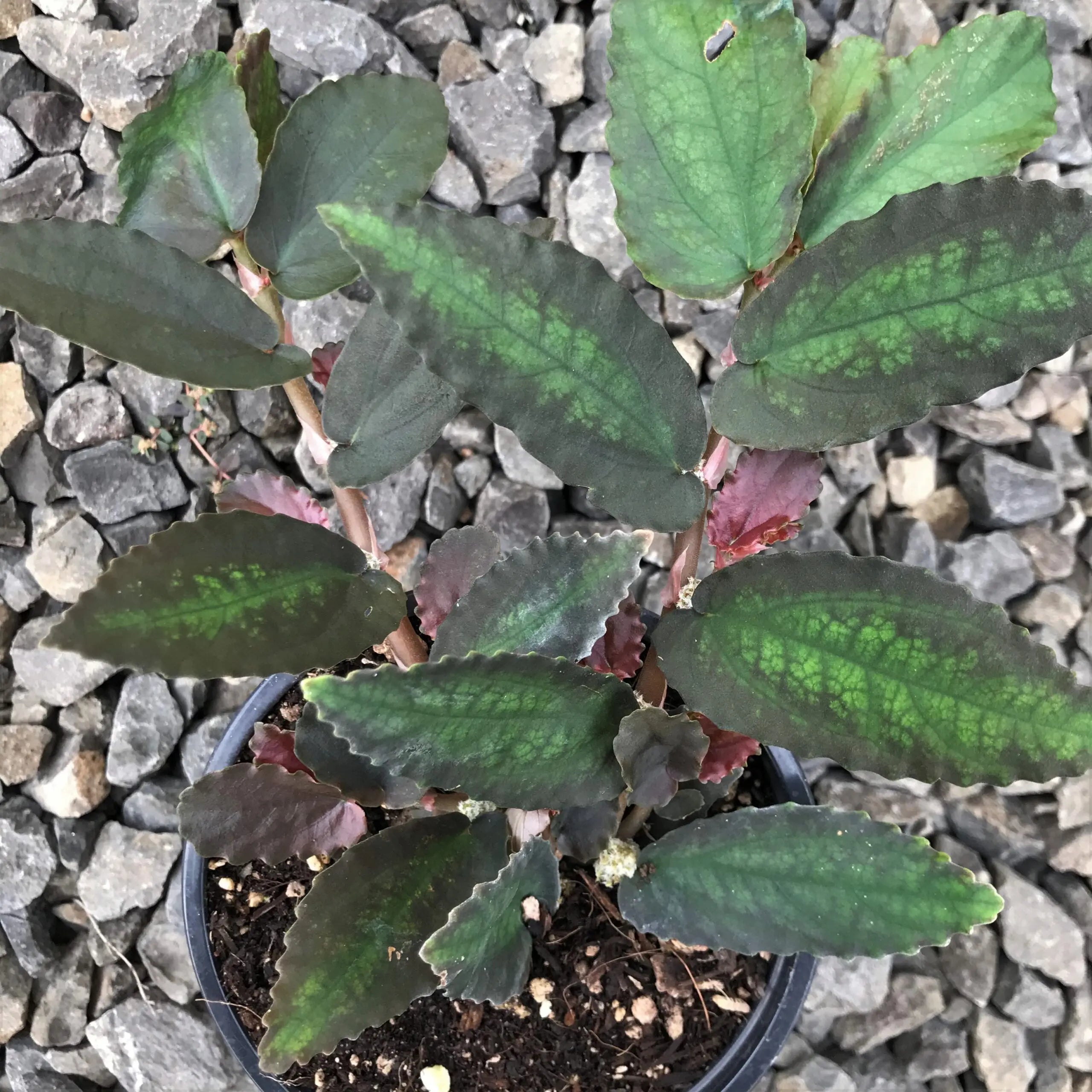 Trailing Watermelon Begonia is an vining plant featuring dark green, lanceolate leaves with a light green central band. The overlap between the two colors creates a whispy, smoky pattern which is very eye catching. Sometimes the leaves will tinge pink or purple. They are carried on long, pink stems which spill over, making this plant an excellent choice for hanging baskets and containers alike.