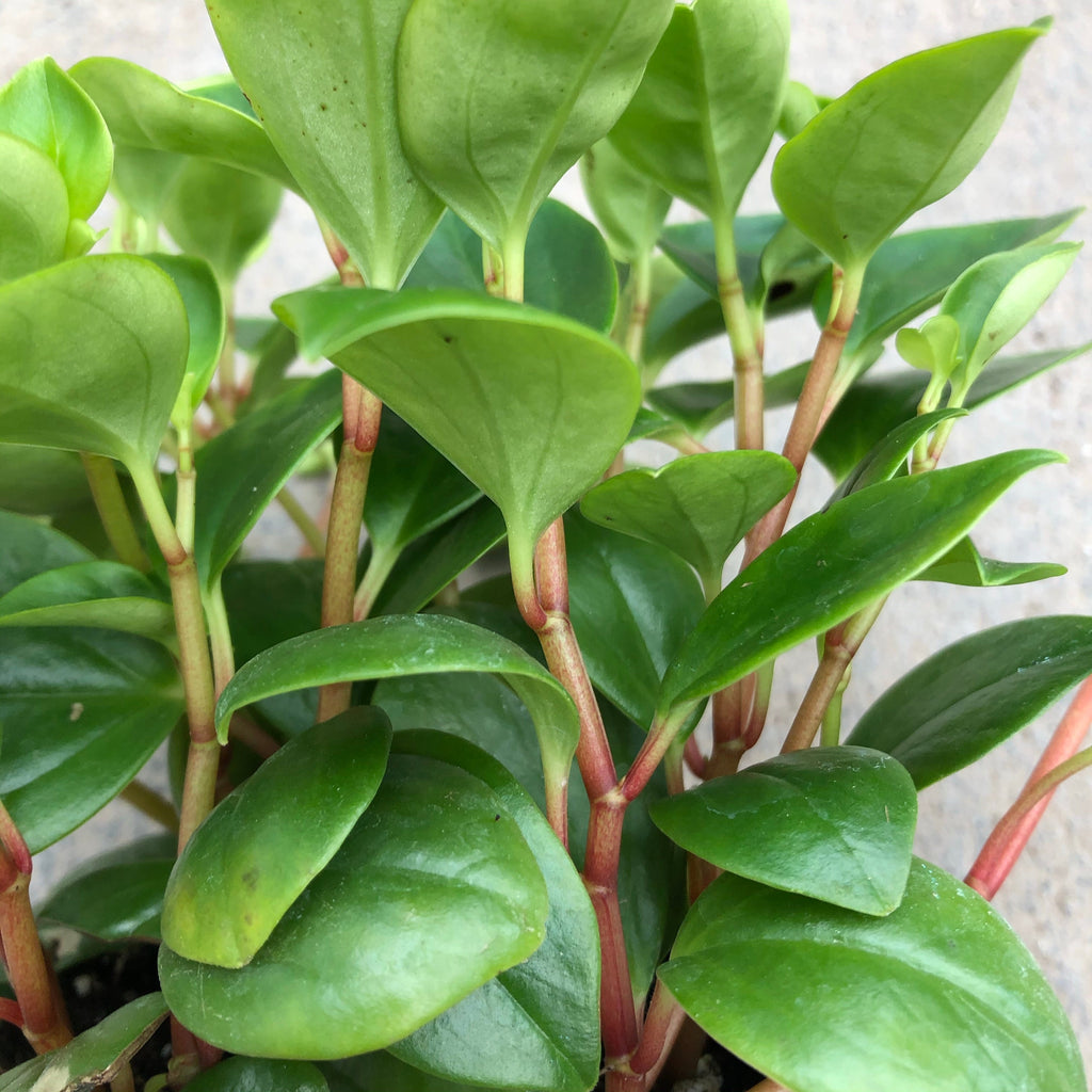 Peperomia cubensis features bright green oval leaves with deep red stems.